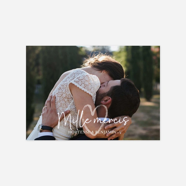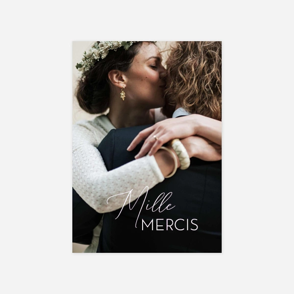 Avec une carte de remerciement personnalisée, vous pourrez partager vos jolies photos de mariés, transmettre les émotions du jour J et remercier avec élégance toutes les personnes qui ont fait de votre union une journée inoubliable. Une fois votre modèle choisi, personnalisez votre carte de remerciement avec votre texte et vos images depuis notre éditeur en ligne. Nos designers vous proposent un modele de remerciement mariage et une mise en forme pour votre message adaptée au style de la création, que vous pourrez modifier à votre guise. Avec nos différentes options, vous pourrez ajuster la taille, la couleur et la typographie selon vos envies pour créer une carte mariage personnalisée et unique. Ainsi plusieurs idées de carte merci mariage sont possibles, vous pourrez par exemple envoyer à votre famille une carte de remerciement noces d’or, ou bien une carte remerciement suite à une invitation de mariage reçue par un couple d’amis. Un service de retouche est inclus dans le prix de nos produits et vous assure un résultat optimal. L’impression est réalisée sur une sélection de papiers haut de gamme au cœur de notre atelier nantais. Vous souhaitez avoir un aperçu du rendu de nos papiers et de la qualité d’impression de nos cartes remerciement mariage ? Il vous est possible de commander gratuitement un essai personnalisé du modèle de votre choix afin de vous faire une idée du rendu de votre création et du papier choisi pour imprimer vos cartes de remerciements. Nous mettons tout notre coeur à l’ouvrage pour vous offrir la meilleure expérience et qualité de service possible pour vos remerciements mariage.