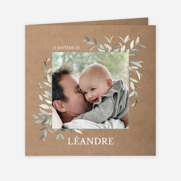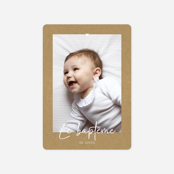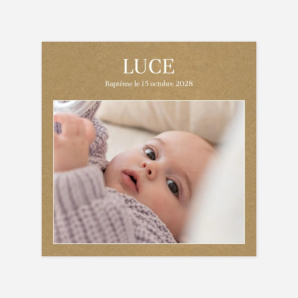 Nos designers ont associé le kraft à des motifs et couronnes végétales qui illustreront parfaitement le thème rétro et champêtre choisi pour l’occasion. Vous retrouverez des modèles poétiques, graphiques ou plus épurés, avec un côté vintage et authentique qui conviendra aussi bien à un baptême civil qu’à une cérémonie religieuse. Nous vous proposons une collection complète avec les menus, livrets de messe, étiquettes ou encore les cartes de remerciement assorties à vos faire-part de baptême kraft. Vous souhaitez personnaliser votre invitation de baptême champêtre avec une photo de votre enfant ? En plus d’annoncer la bonne nouvelle, votre faire-part sera un vrai souvenir que vos proches pourront conserver après l’événement. L’impression de votre papeterie de baptême au rendu kraft se fait sur un papier de création aux finitions haut de gamme, que nous vous laissons choisir parmi notre sélection de papiers faire-part concoctée par les experts de notre atelier.