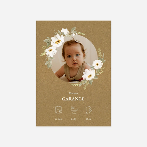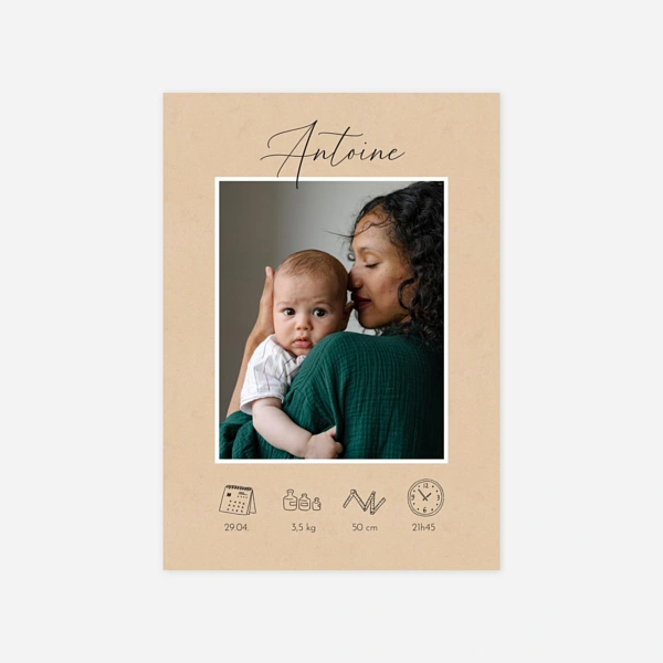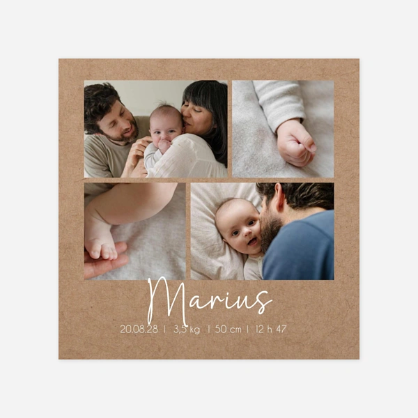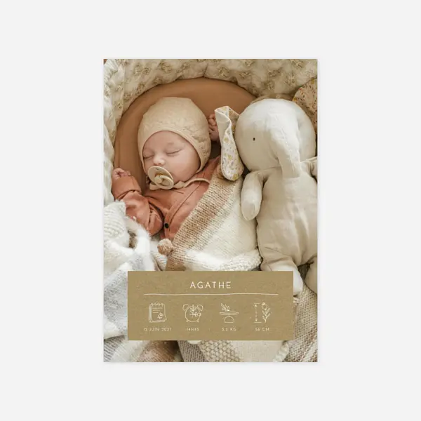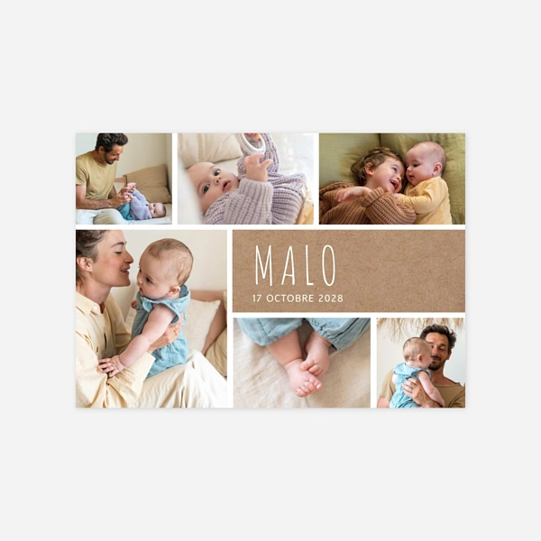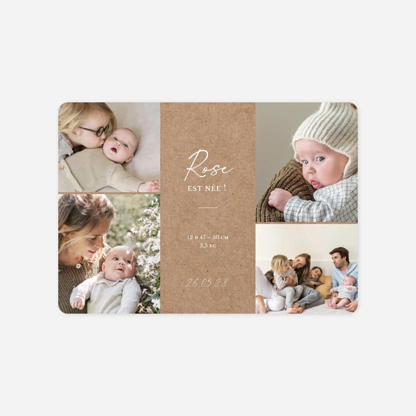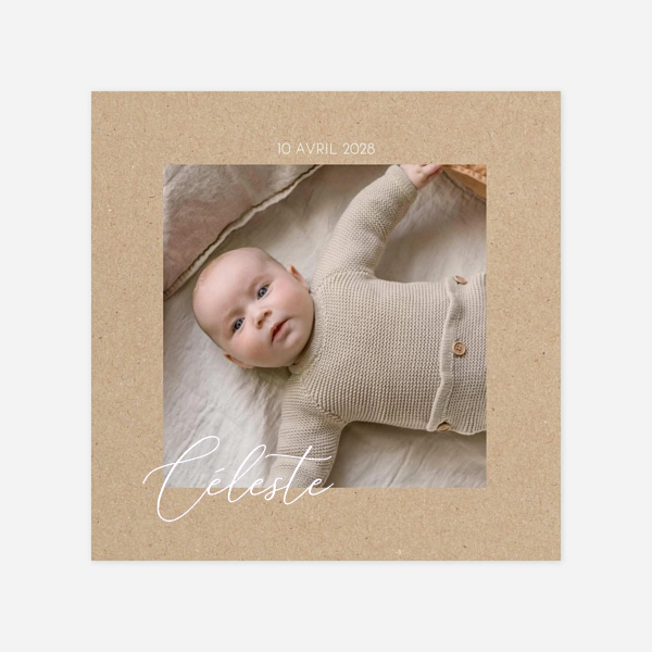 Notre collection de faire-part de naissance kraft fait la part belle aux tons et aux matières naturelles pour vous offrir des créations pleines d’authenticité et d’élégance. Nous avons imaginé pour vous de jolis designs qui combinent des mises en page modernes, simples ou plus graphiques, avec un charme naturel. Leur rendu se rapproche du kraft avec un coloris beige ou marron, qui mettra particulièrement en valeur vos photos, vos textes et les illustrations de nos designers. Idéal pour les jeunes parents en quête d’un faire-part de naissance vintage ou nature aux notes rétro, le faire-part kraft convient aussi bien à la naissance d’une petite fille que celle d’un petit garçon et s’adapte à de nombreux styles. Au fil de nos créations, nous pouvons ainsi associer le kraft à des pictogrammes pour un côté ludique, à des illustrations à l’aquarelle pour un côté naturel ou champêtre, à des pêle-mêle de photos pour un style moderne ou de la dorure à chaud pour une touche de raffinement supplémentaire. Vous trouverez dans notre collection différents types et formats de faire-part, du traditionnel carré ou portrait au plus original et design format bandeau ou marque-page. Nous avons privilégié des couleurs claires ou pastel pour les motifs et les textes, afin de faire ressortir le délicat jeu de matière qu’offre le kraft, imaginé comme un élément graphique essentiel sur chacune de nos créations.