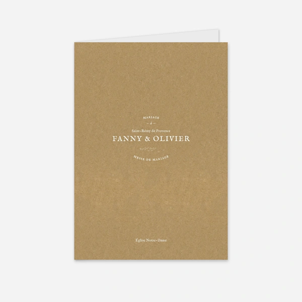 Nos livrets de messe se présentent sous forme de jolies couvertures, personnalisables sur la première et la dernière page avec le texte de votre choix. Elles sont constituées d’un papier plié au format 15,1 x 21,4 cm, dans lesquelles vous pourrez insérer les feuillets contenant le déroulé de votre cérémonie. Une fois vos textes, prières et chants imprimés par vos soins, il vous suffira de les glisser à l’intérieur de la couverture et de les assembler à l’aide d’un ruban ou d’une ficelle, pour un rendu soigné et harmonieux. Cette solution vous permet de conserver une grande liberté dans la mise en page du contenu intérieur, tout en profitant d’un livret de messe parfaitement assorti à votre papeterie de mariage.