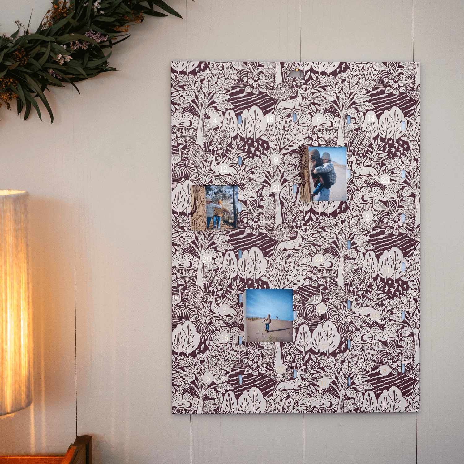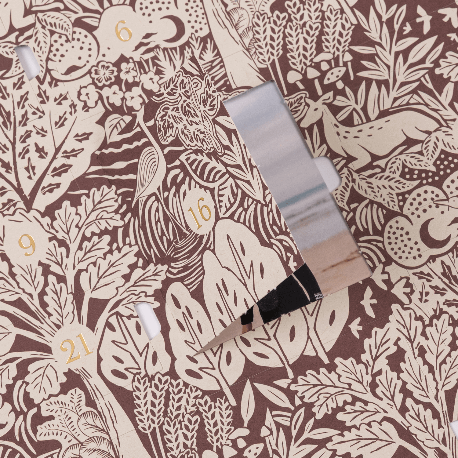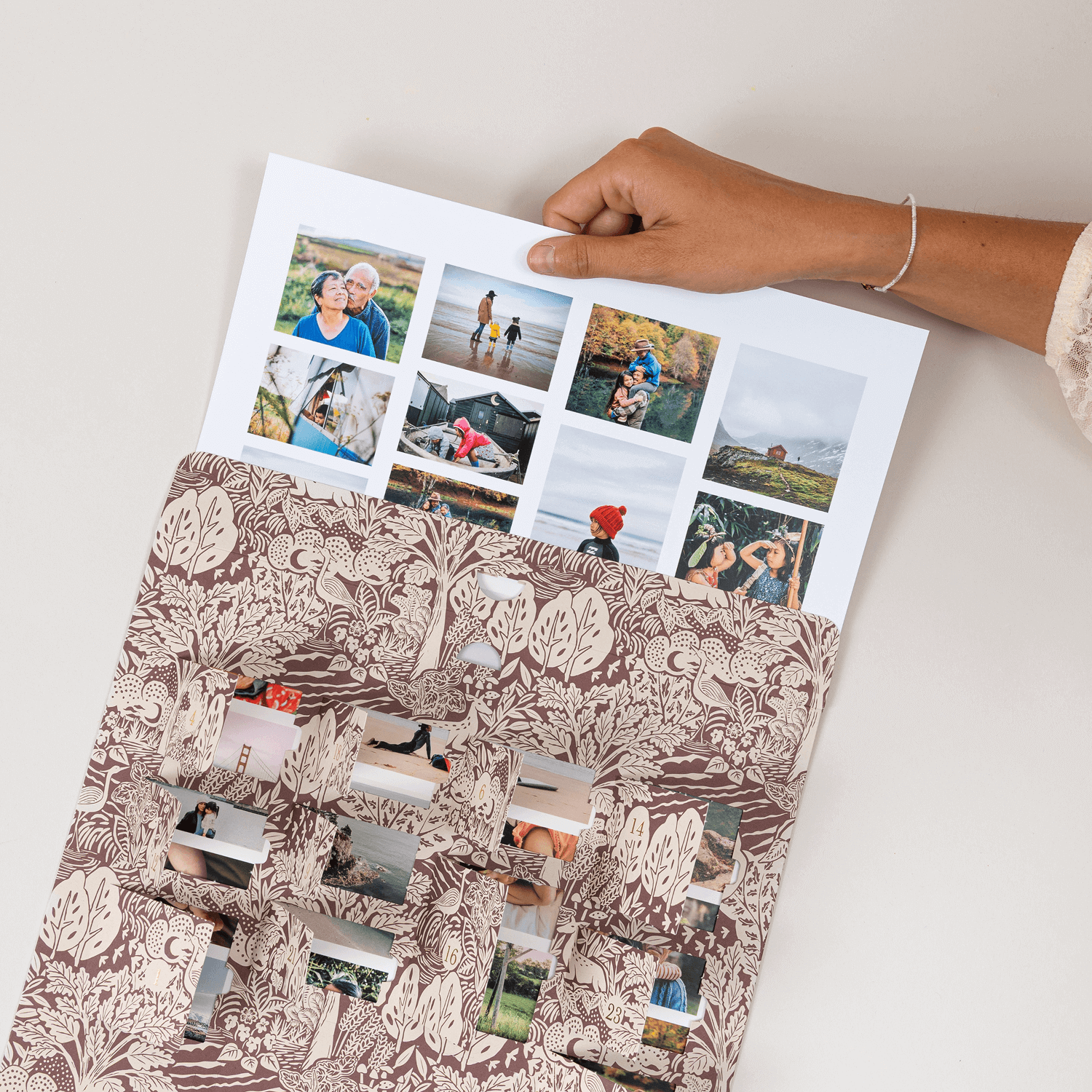 Patientez jusqu'à Noël avec notre calendrier de l'Avent enchanteur "Bosquet". Son illustration riche et artistique vous transporte dans un paysage forestier féerique, où différents habitants des bois se cachent au creux du feuillage. D'élégants chiffres dorés apportent une touche festive au design, et derrière chaque petite fenêtre se dissimulent vos moments photo préférés.