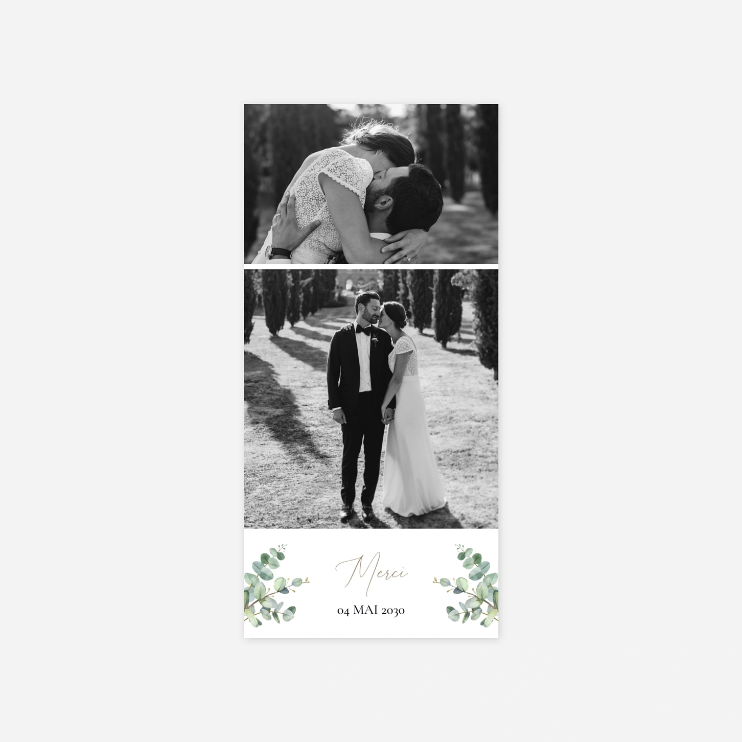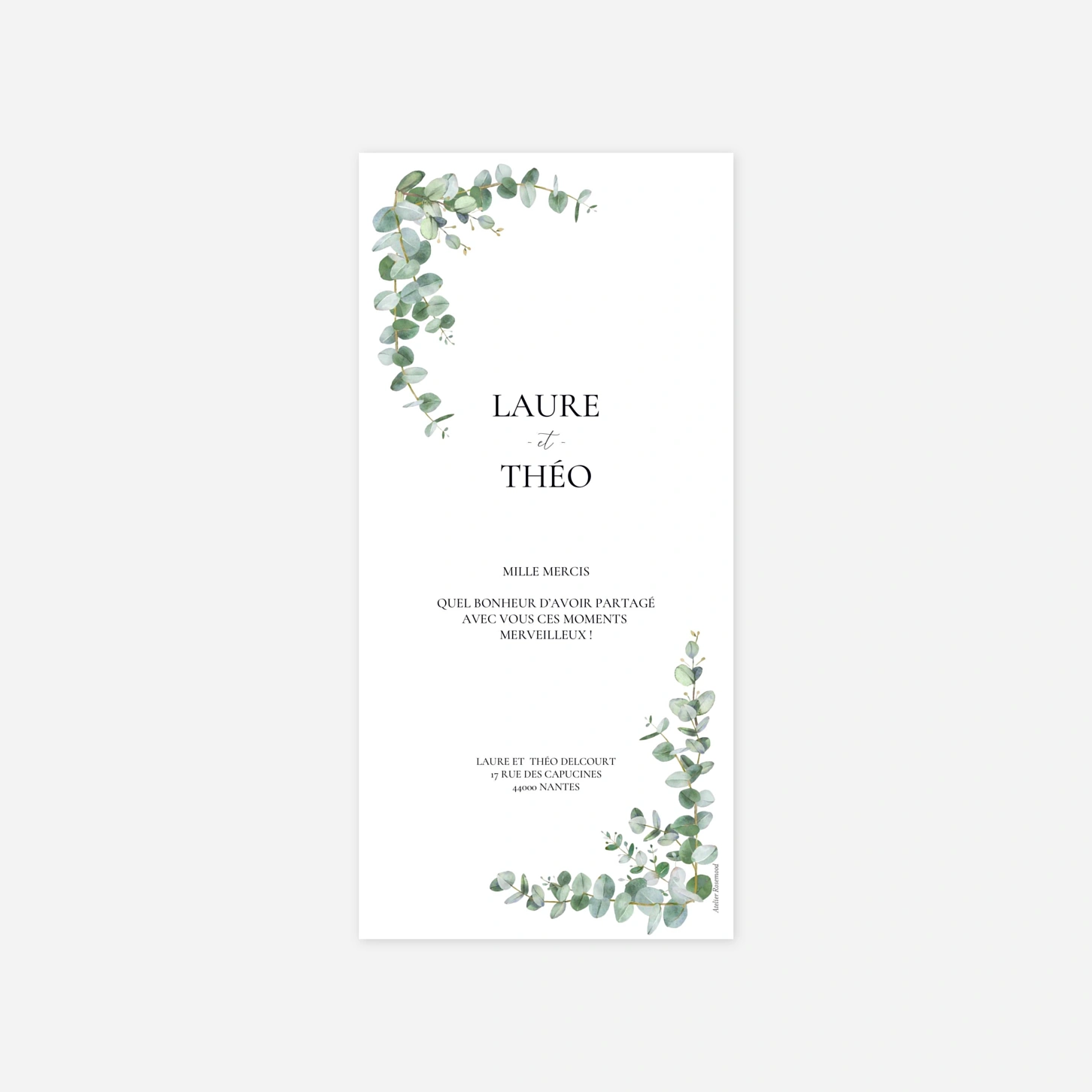 Assortie à votre papeterie, la carte de remerciement personnalisée « Douce verdure » est une attention élégante pour remercier vos proches et leur laisser un joli souvenir de votre grand jour. Personnalisez-la facilement depuis notre éditeur en ligne.