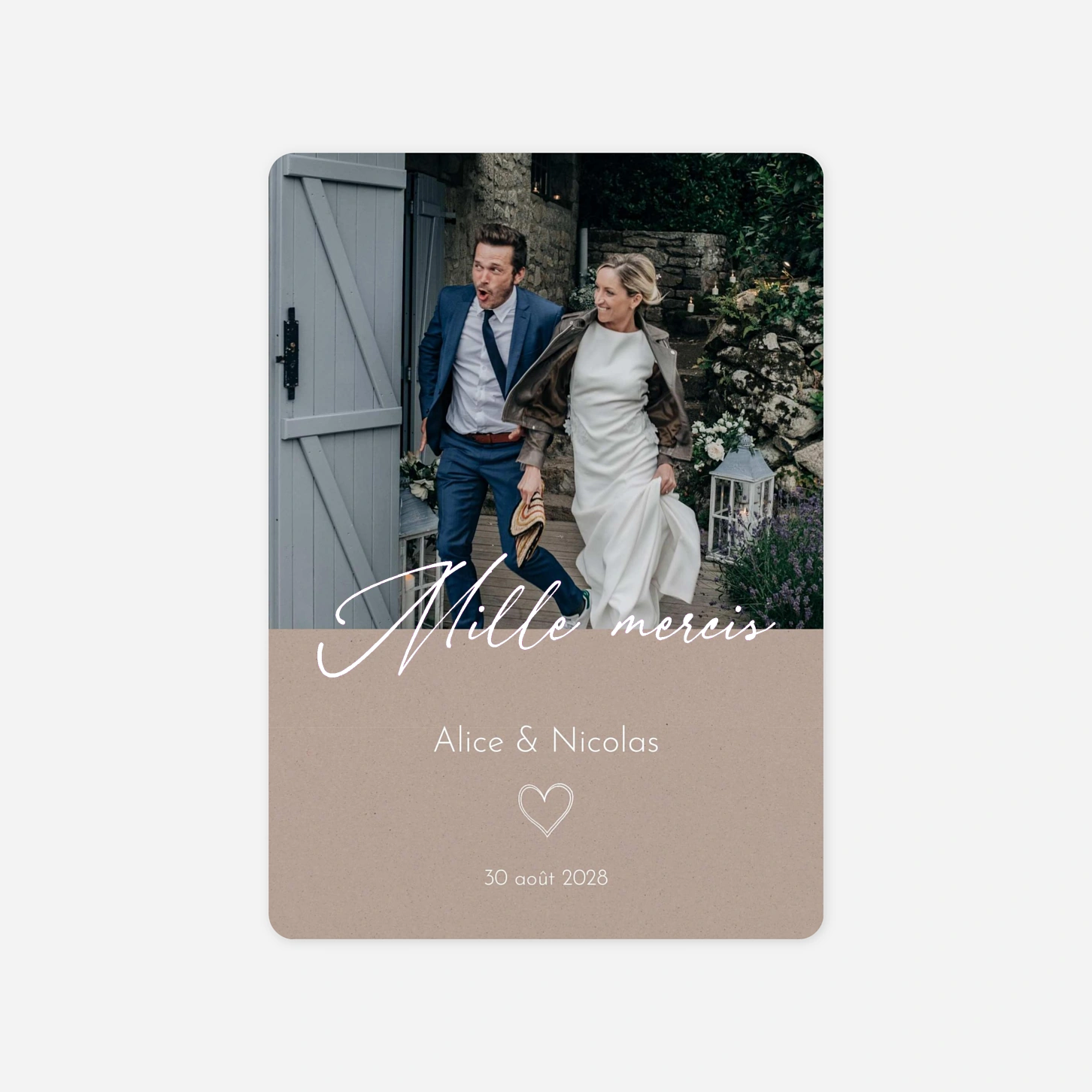 Assortie à votre papeterie, la carte de remerciement personnalisée « Signes d’Amour » est une attention élégante pour remercier vos proches et leur laisser un joli souvenir de votre grand jour. Personnalisez-la facilement depuis notre éditeur en ligne.