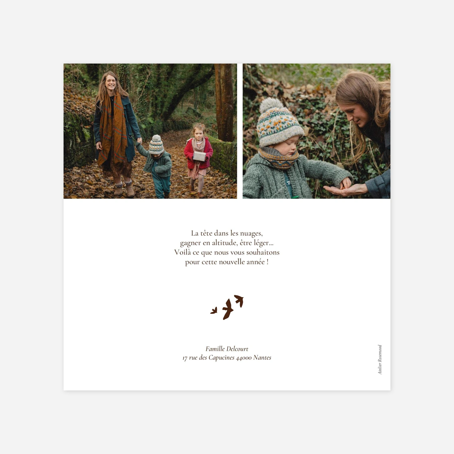 La carte de voeux "Bosquet" se distingue par ses délicats motifs floraux et botanique, formant une composition à la fois élégante et poétique pour envoyer vos voeux à vos proches. Disponible en 2 coloris : marron vert. Ce faire-part se personnalise en ligne avec votre texte et vos photos. Offrez à vos proches un souvenir unique avec ce faire-part plein de poésie.