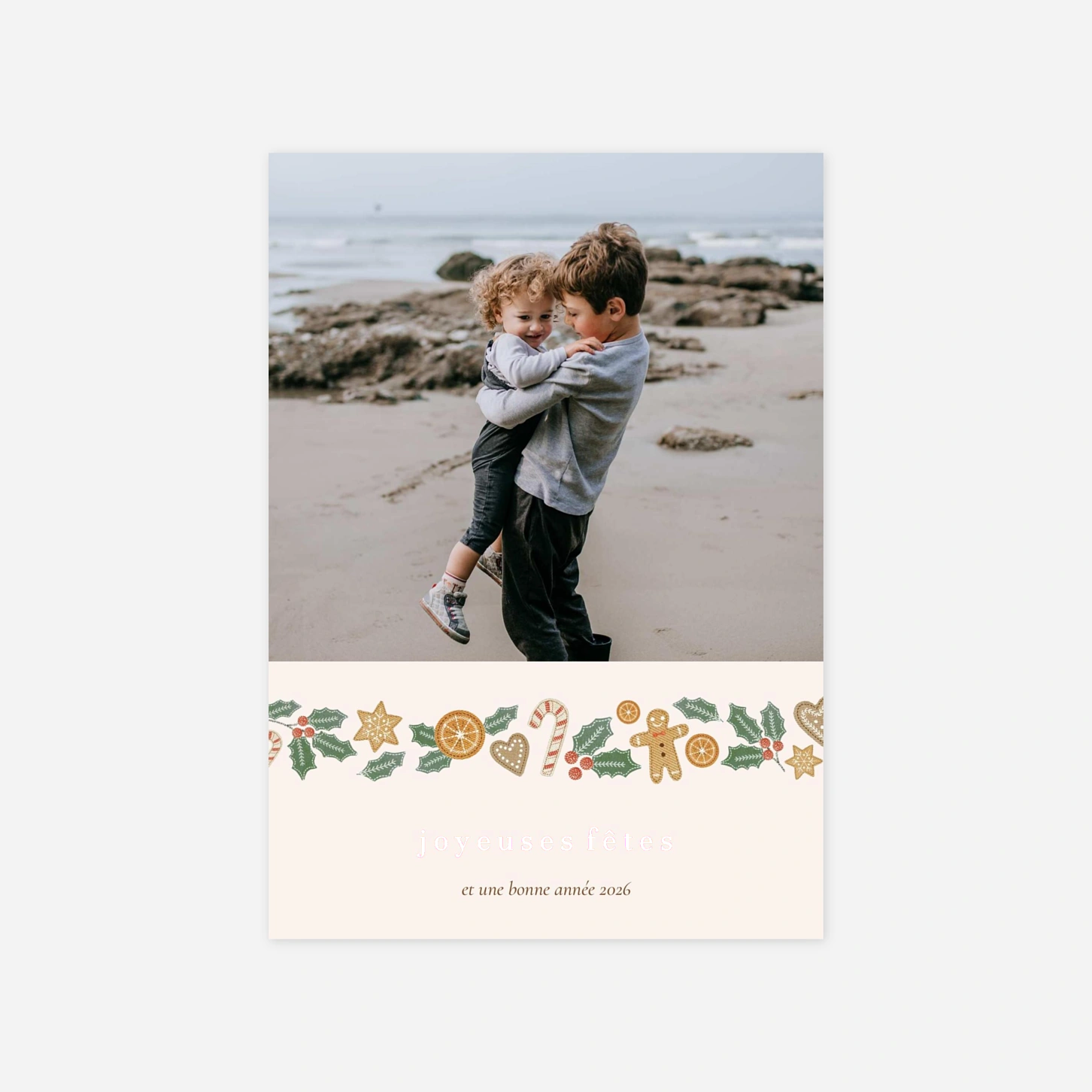 La carte de vœux Petits biscuits célèbre l’esprit gourmand et convivial des fêtes avec sa frise décorative inspirée des douceurs de fin d’année. Elle met joliment en avant votre photo, pour des vœux à la fois tendres et personnalisés.