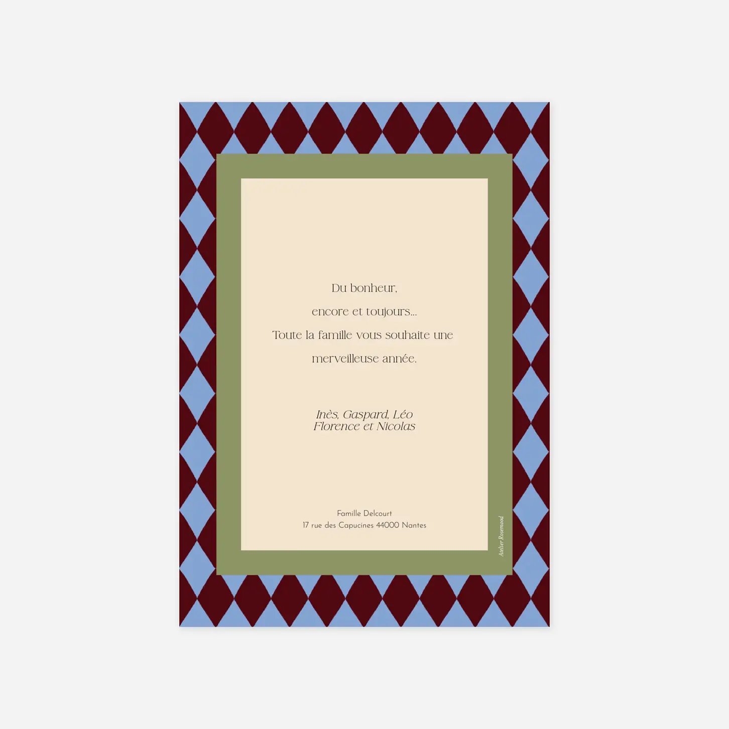 La carte de vœux "Réveillon chromatique" illumine les foyers avec ses teintes joyeuses et ses illustrations pleines d’amour. Parfaite pour ceux qui souhaitent offrir à leurs proches un Noël haut en couleur et riche en émotions. Montrez à vos proches que vous pensez à eux en ajoutant une photo et un message personnalisé. Pour encore plus d'élégance, optez pour le design avec une finition dorée.