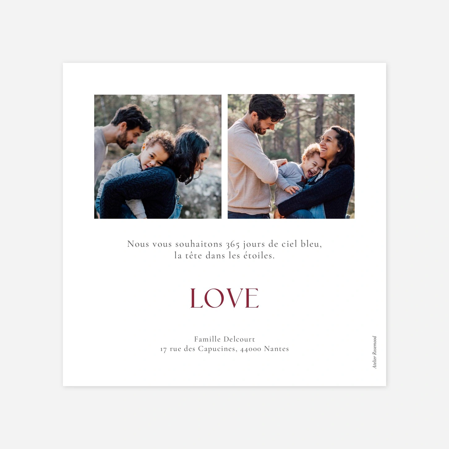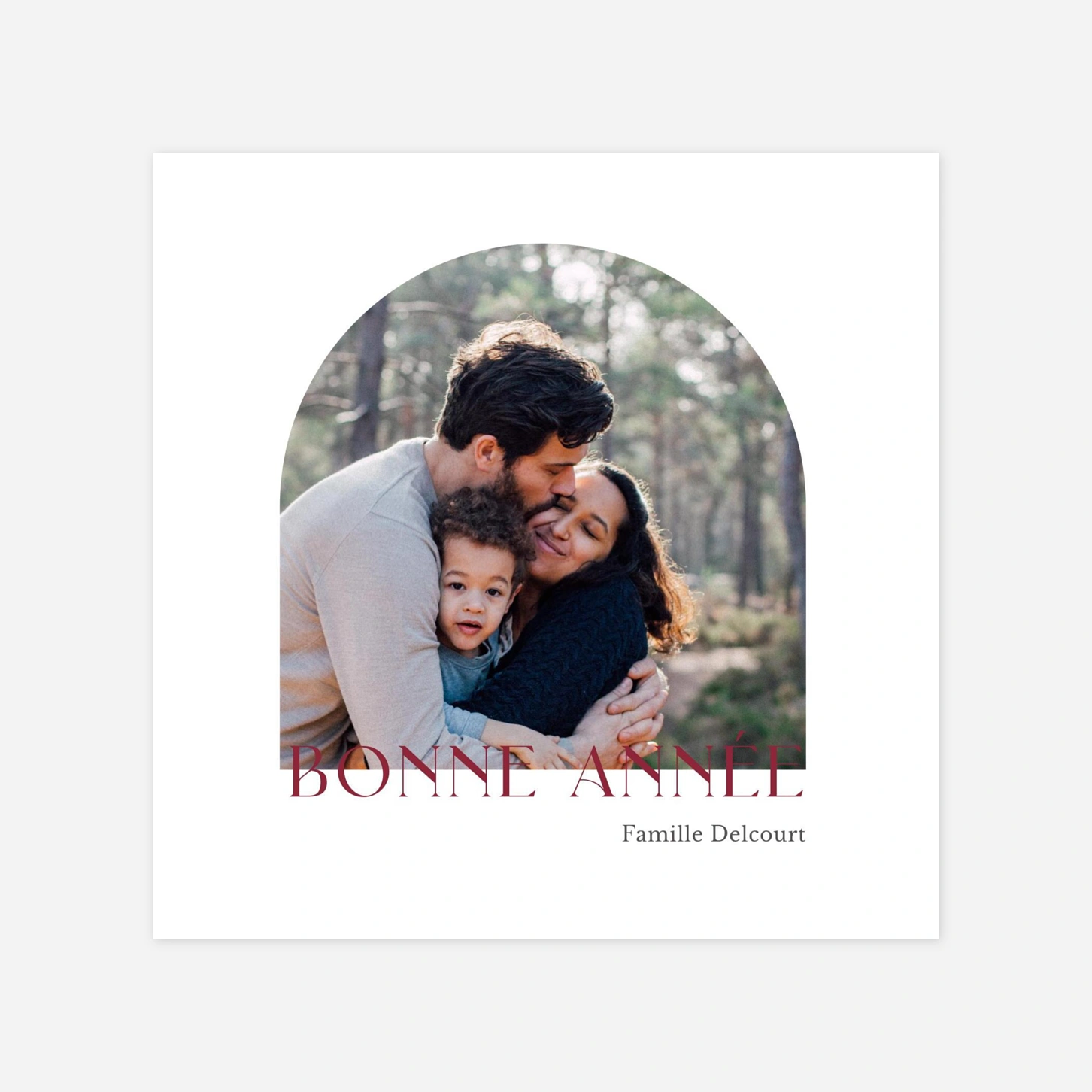 Une jolie forme d’arche pour valoriser votre photo préférée, des lettres capitales et graphiques pour mettre en avant votre message de bonne année… Avec son design sobre et épuré, la carte de vœux Storia racontera en toute simplicité à vos proches la plus belle des histoires : celle de votre année écoulée ! Cette carte dispose d’un format carré personnalisable au recto et au verso avec votre texte et vos photos.