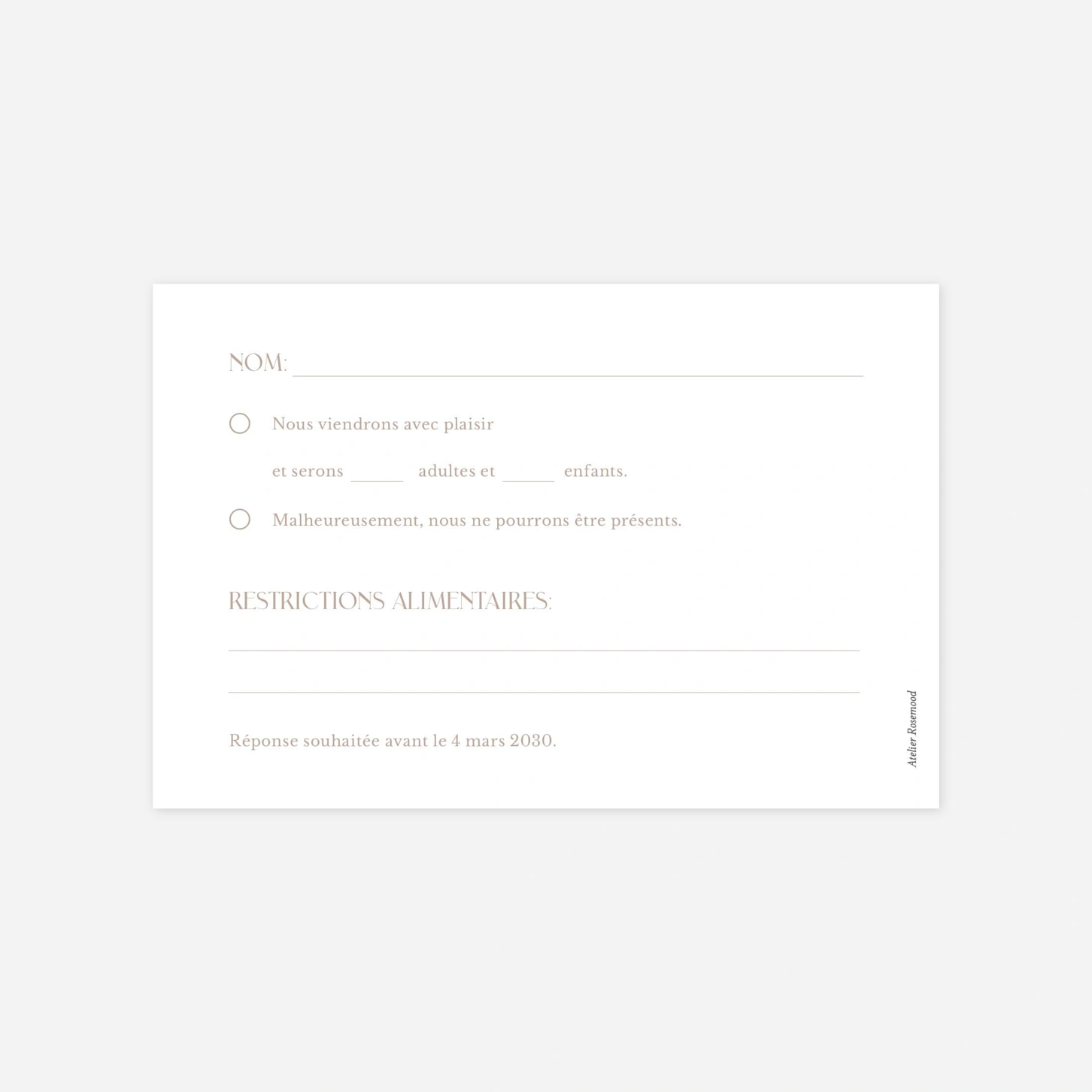 L’élégante carte réponse de mariage « Éclat Naturel » accompagnera parfaitement votre faire-part pour une papeterie de mariage harmonieuse et raffinée. Son design allie simplicité et touche végétale, invitant vos proches à confirmer leur présence avec douceur. Ce modèle se personnalise facilement en ligne avec vos informations et s’imprime sur nos papiers haut de gamme dans nos ateliers en France et en Allemagne. Une création au charme naturel pour compléter votre ensemble de mariage avec élégance.