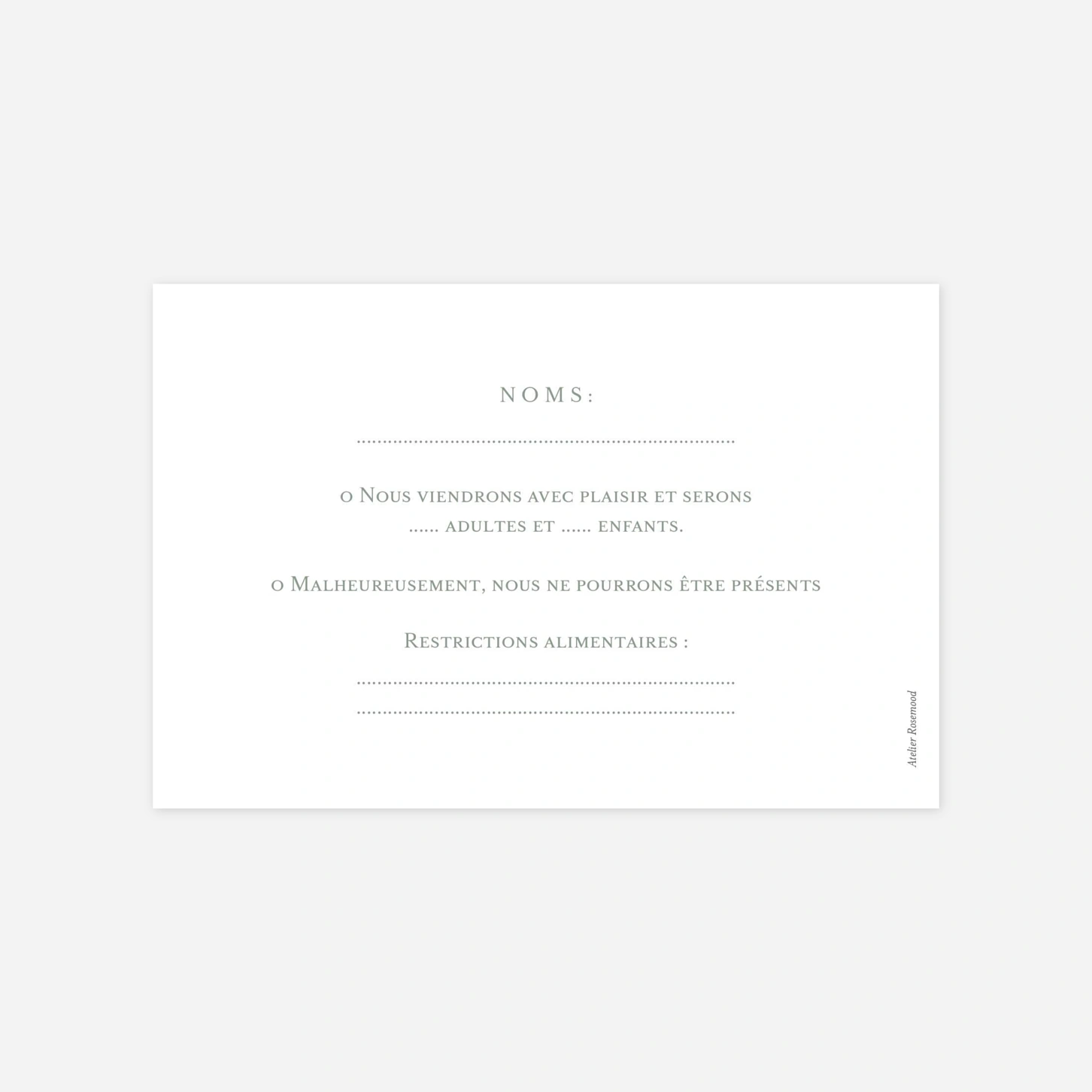 Associez le carton réponse mariage « Notre lien » au faire-part du même nom pour compléter votre courrier d’invitation. Vos destinataires pourront ainsi vous indiquer s’ils seront présents aux festivités suivant la cérémonie, et vous préciser également d’éventuelles restrictions alimentaires pour le repas ou d’autres éléments pouvant faciliter votre organisation.