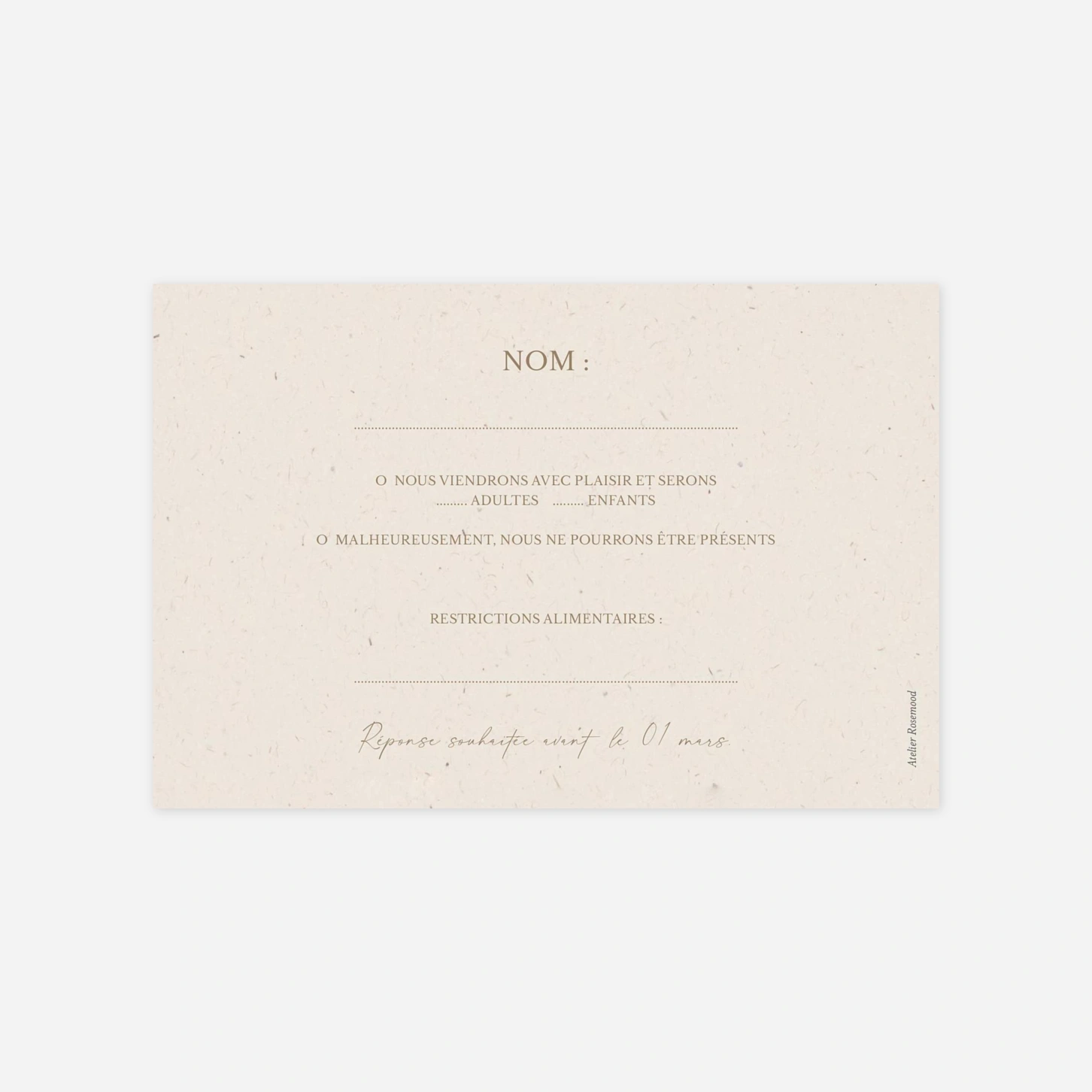 Associez le carton réponse mariage « Passepartout » au faire-part du même nom pour compléter votre courrier d’invitation. Vos destinataires pourront ainsi vous indiquer s’ils seront présents aux festivités suivant la cérémonie, et vous préciser également d’éventuelles restrictions alimentaires pour le repas ou d’autres éléments pouvant faciliter votre organisation.