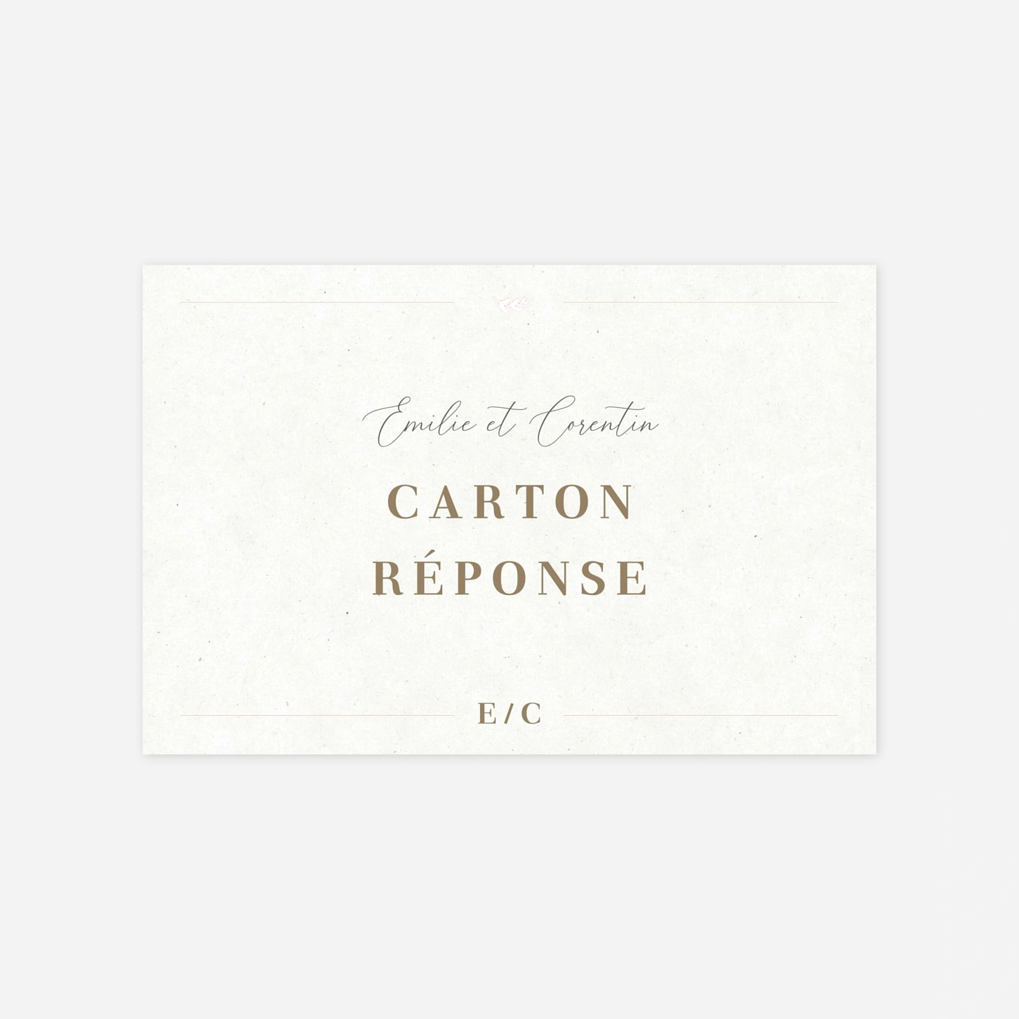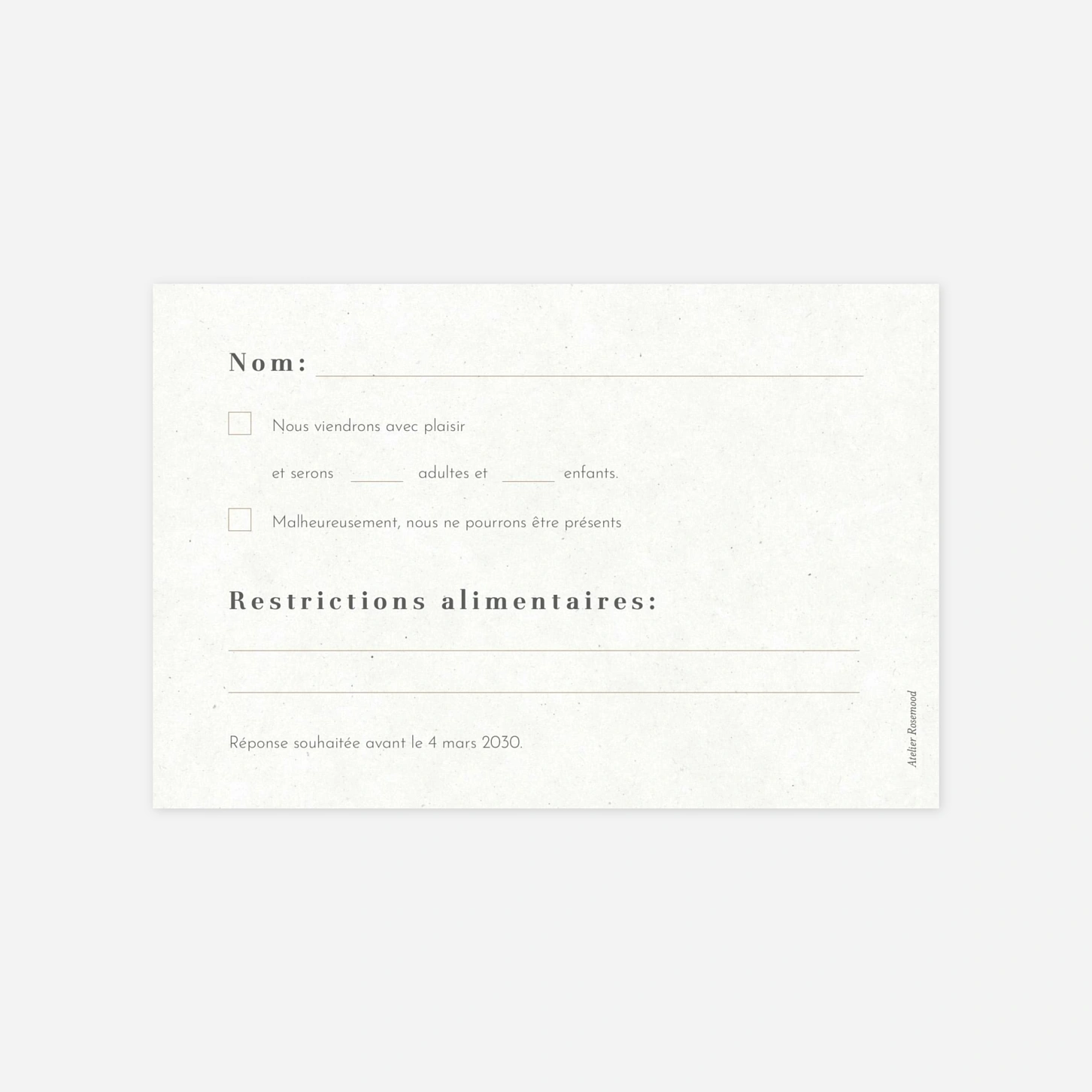 La carte de réponse de mariage « Pure Sérénité » accompagne avec douceur votre ensemble de papeterie pour recueillir les précieuses confirmations de vos invités. Ce modèle offre une mise en page claire et élégante pour une carte RSVP mariage à personnaliser selon vos besoins. Réalisée dans nos propres ateliers en France et en Allemagne, elle bénéficie d’une impression soignée sur de beaux papiers. Grâce à notre outil en ligne, vous configurez facilement votre réponse mariage personnalisée pour harmoniser chaque détail de votre journée.