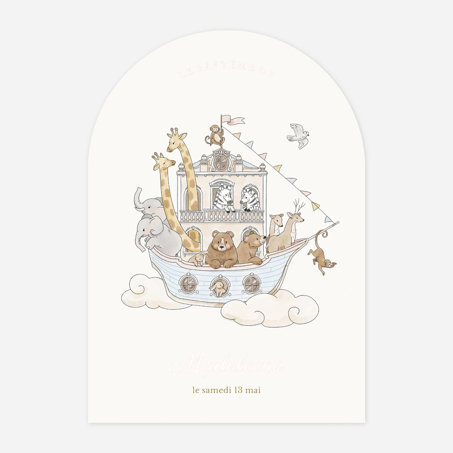 Le faire-part de baptême « Arche des Merveilles » embarque vos proches dans un univers tendre et rêveur, comme une jolie traversée peuplée d’animaux attachants. Cette invitation de baptême au charme illustré met en lumière le prénom de votre enfant et annonce la célébration avec douceur, tout en laissant place à votre message. Personnalisez facilement votre texte en ligne pour créer un faire-part de baptême personnalisé à votre image. Imprimée avec haute précision dans nos ateliers en France et en Allemagne, votre création promet une finition soignée, à la hauteur de ce moment précieux.