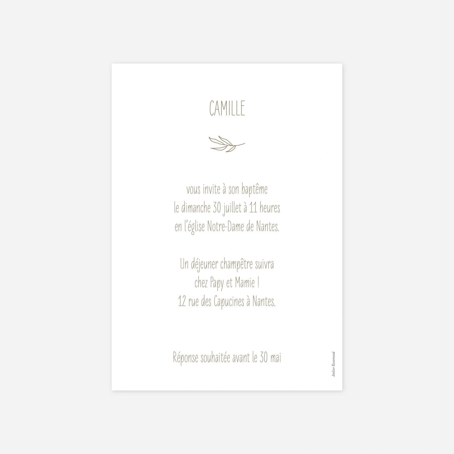 Le faire-part de baptême « Brin d’olivier » annonce ce moment précieux avec une douceur naturelle et une élégance intemporelle. Sa mise en page épurée, ponctuée de délicats symboles végétaux, met à l’honneur la photo de votre enfant pour une invitation de baptême pleine de sens. Facile à personnaliser en ligne avec votre texte et vos images, ce faire-part de baptême personnalisé est une création conçue en interne et imprimée avec soin dans nos ateliers en France et en Allemagne. Personnalisez le vôtre dès maintenant pour partager cette belle célébration avec vos proches.