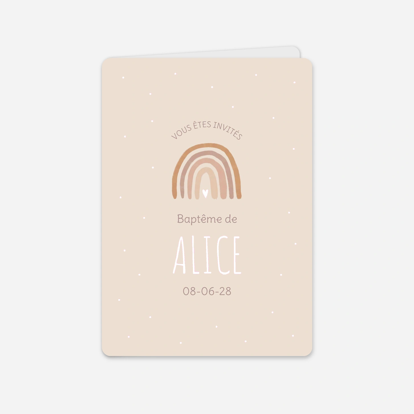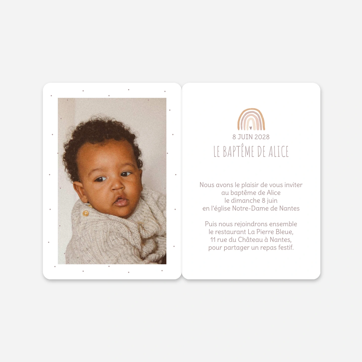 Le faire-part de baptême « Petit arc-en-ciel » invite vos proches à célébrer ce moment précieux avec douceur et poésie. Son illustration délicate et son univers apaisant en font un faire-part de baptême personnalisé, parfait pour annoncer cette belle étape de vie avec tendresse. Créé et imprimé avec soin dans nos propres ateliers en France et en Allemagne, ce modèle met en valeur la qualité de nos papiers et notre savoir-faire artisanal. Personnalisez facilement votre invitation de baptême en ligne pour partager une annonce à votre image.