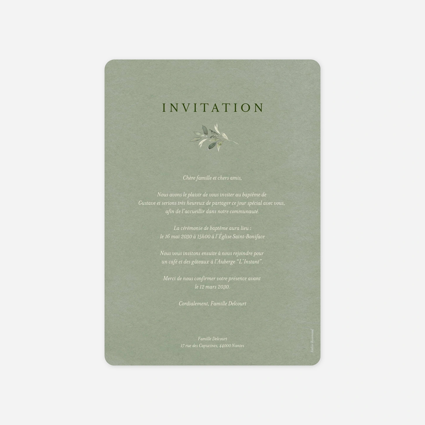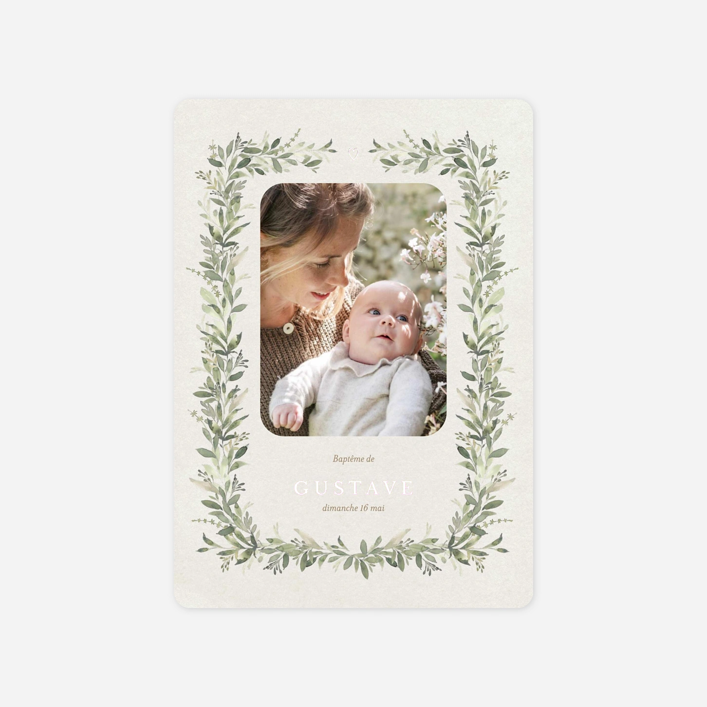 Avec son délicat cadre de feuillage, le faire-part de baptême « Petit laurier » annonce la cérémonie avec élégance et toute en douceur. La grande place laissée à votre photo met en lumière ce moment précieux, tandis que la typographie épurée souligne le prénom et les informations essentielles. Personnalisez facilement votre faire-part de baptême personnalisé en ligne pour créer une invitation de baptême élégante, à votre image. Imprimé avec précision dans nos propres ateliers en France et en Allemagne, pour un rendu soigné jusque dans les moindres détails.
