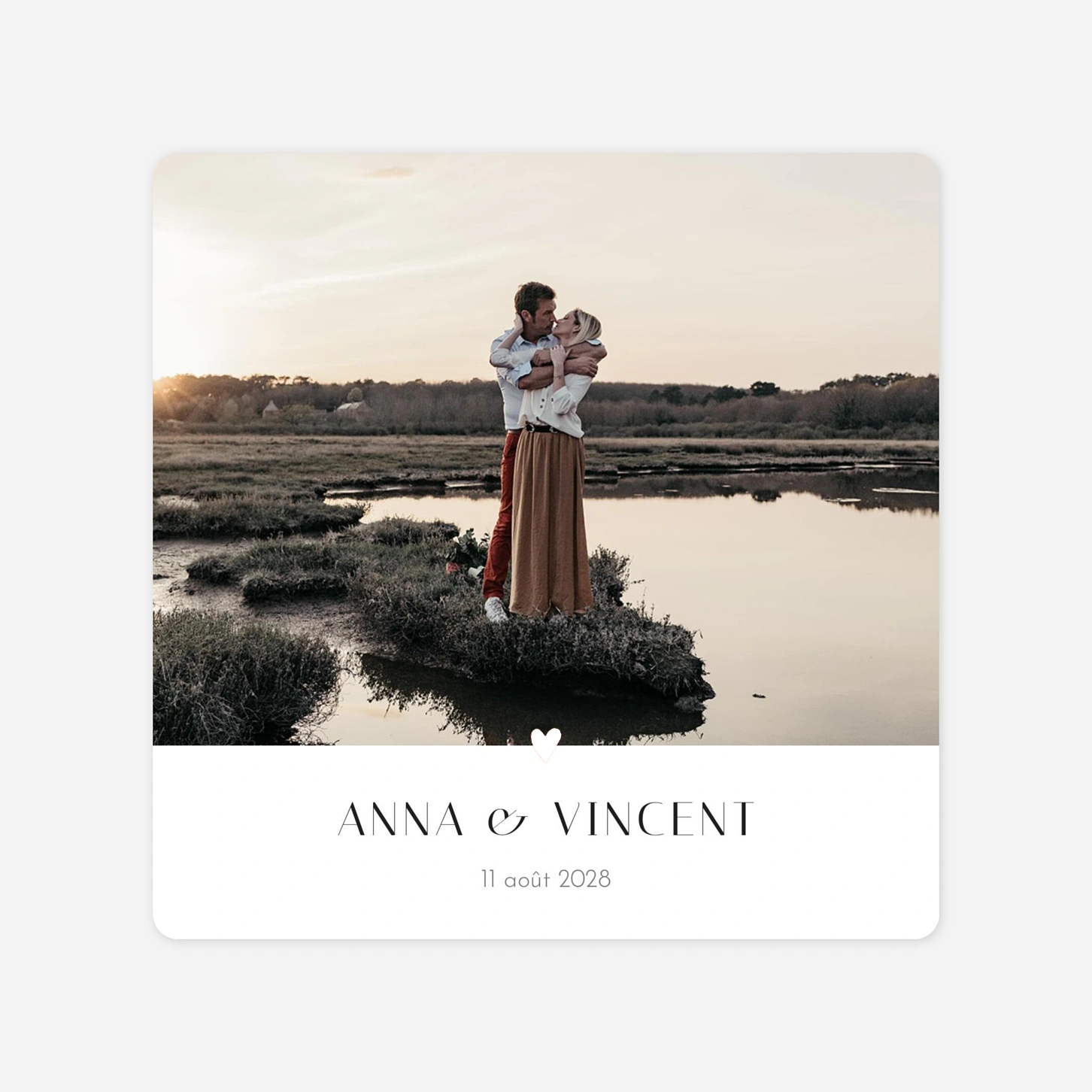 Une annonce tout en élégance avec le faire-part de mariage Coeur d’or. L’esprit graphique de sa mise en page et la finesse de sa dorure artisanale en feront un courrier très spécial ! Ce joli coeur doré viendra illuminer votre plus belle photo pour un rendu très délicat. Dans l’esprit sobre et minimaliste de ce modèle, nous avons choisi une typo graphique en lettres capitales pour mettre en avant vos deux prénoms. Impression haut de gamme réalisée sur de beaux papiers de création.