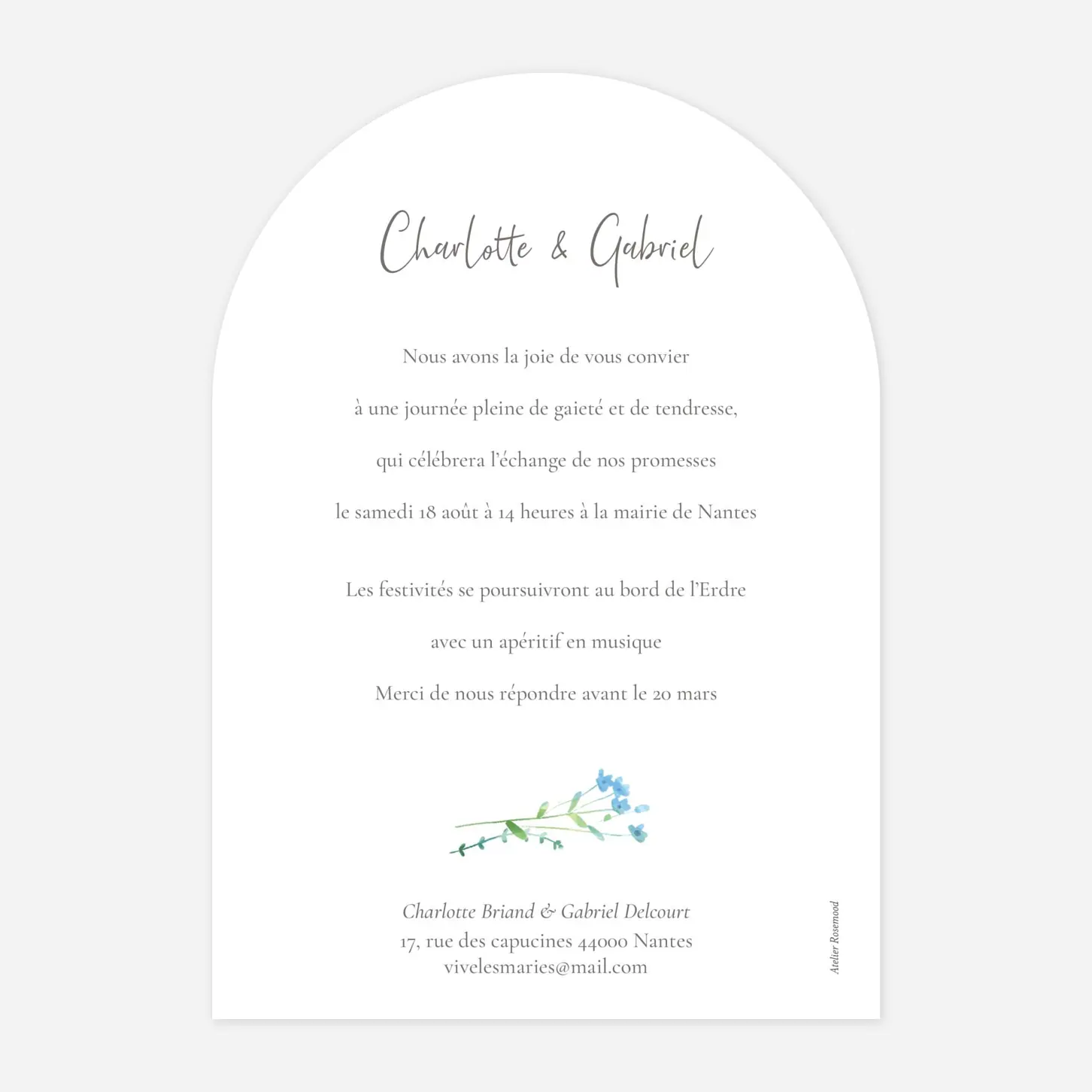 Découvrez notre faire-part de mariage Couronne florale et sa délicate ronde de fleurs aquarellées, qui réunira vos prénoms avec élégance et légèreté. Si le thème choisi pour votre union sera bucolique ou végétal, alors ce modèle sera idéal ! Nous avons imaginé ses illustrations florales en trois déclinaisons de couleur : rose, bleu et ocre. Personnalisez le message d’invitation avec notre outil d’édition et ajustez la mise en forme du texte à votre guise. Vous pourrez ajouter au verso une photo de votre couple pour illustrer votre annonce. Retrouvez également le carton d’invitation et carton réponse assortis dans notre gamme Couronne florale.
