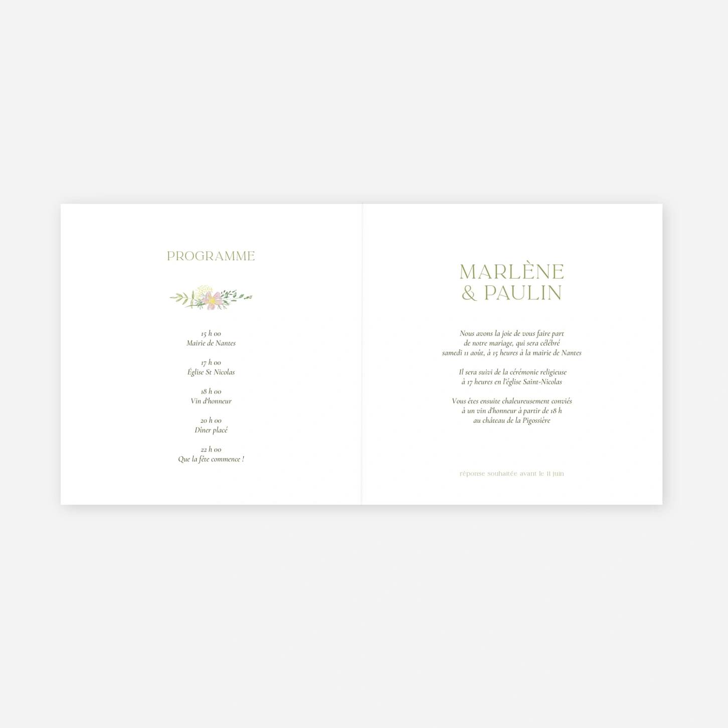 - Pages intérieures : 1 double-page pour les marié.e.s, 2 doubles-pages différentes pour les invités.