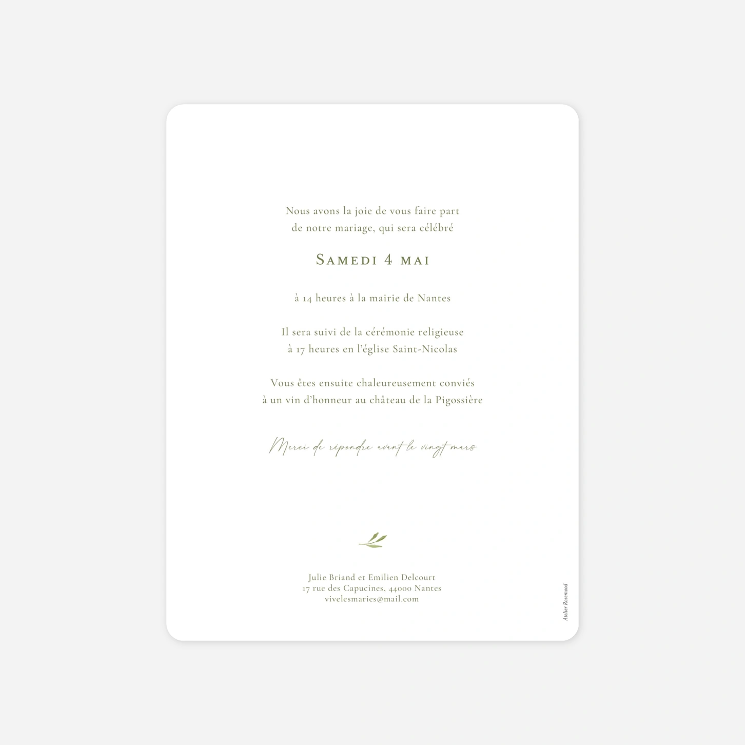 Sur le faire-part de mariage Instant botanique, un arche végétal décore avec finesse votre invitation, pour annoncer avec douceur et élégance votre union. 4 déclinaisons au choix : blanc, terracotta, vert ou effet kraft. Ce faire-part se personnalise au recto et au verso avec votre texte sur notre éditeur en ligne. Impression haut de gamme sur de beaux papiers de création.