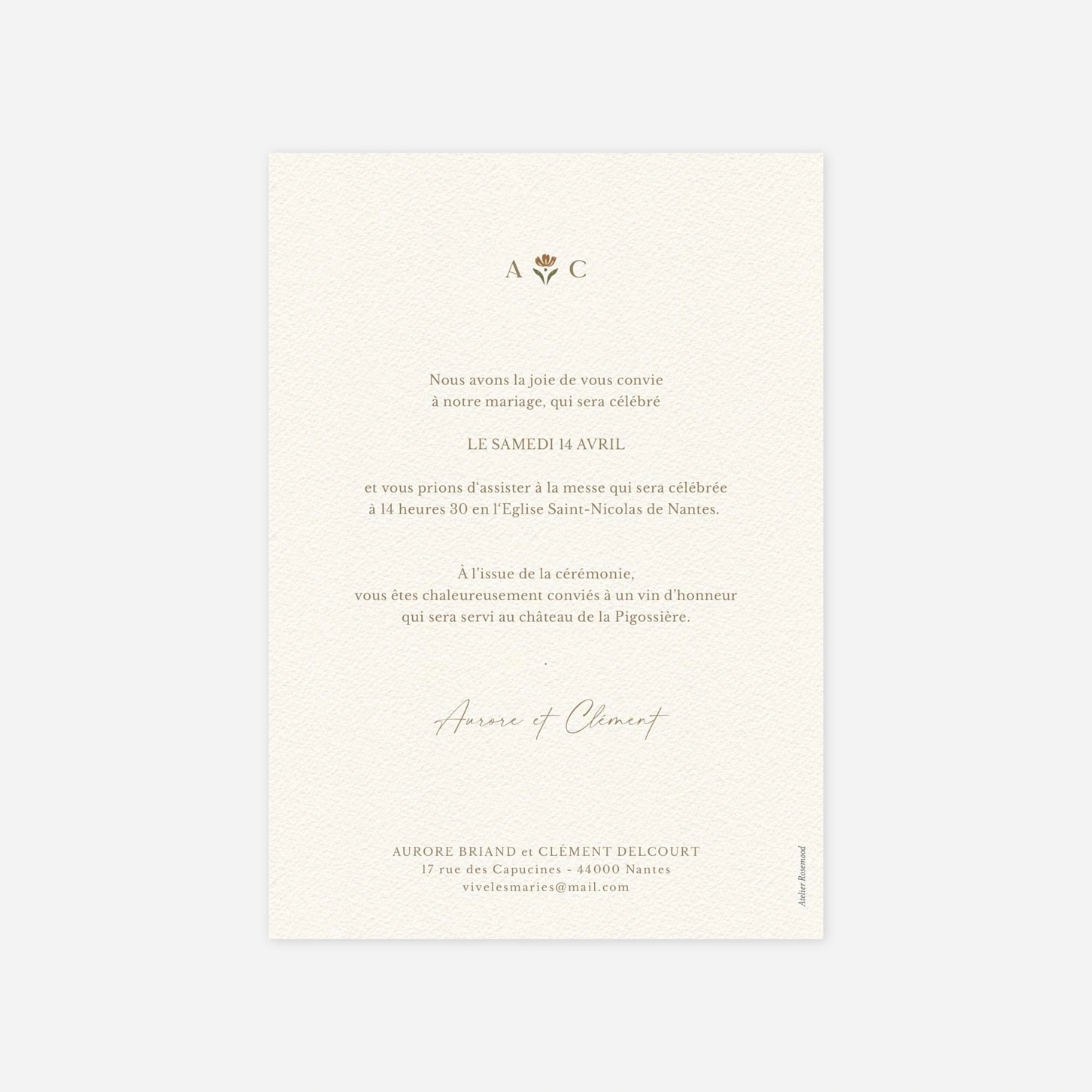 « Jardin éternel » encadre votre texte d’une délicate bordure florale aux détails soignés, inspirée des motifs traditionnels. Les ornements raffinés guident le regard vers vos prénoms et la date de votre mariage, placés au centre comme un précieux souvenir. La composition harmonieuse et la finesse du dessin évoquent l’artisanat d’autrefois. Cette mise en page classique, relevée d’une pointe de poésie, saura séduire les couples attachés au charme et à la tradition. « Jardin éternel » est une invitation qui transmet chaleur et élégance dès le premier regard.