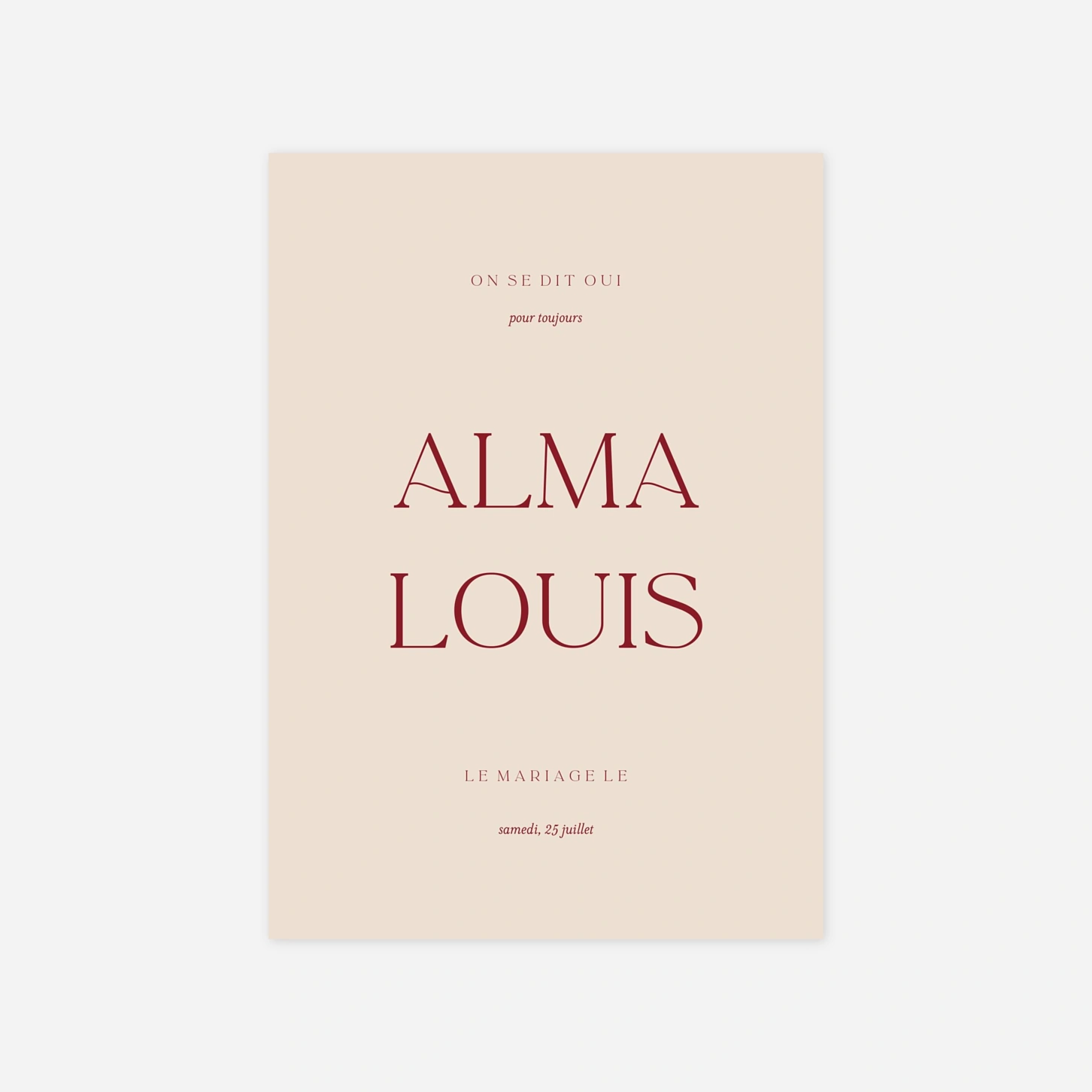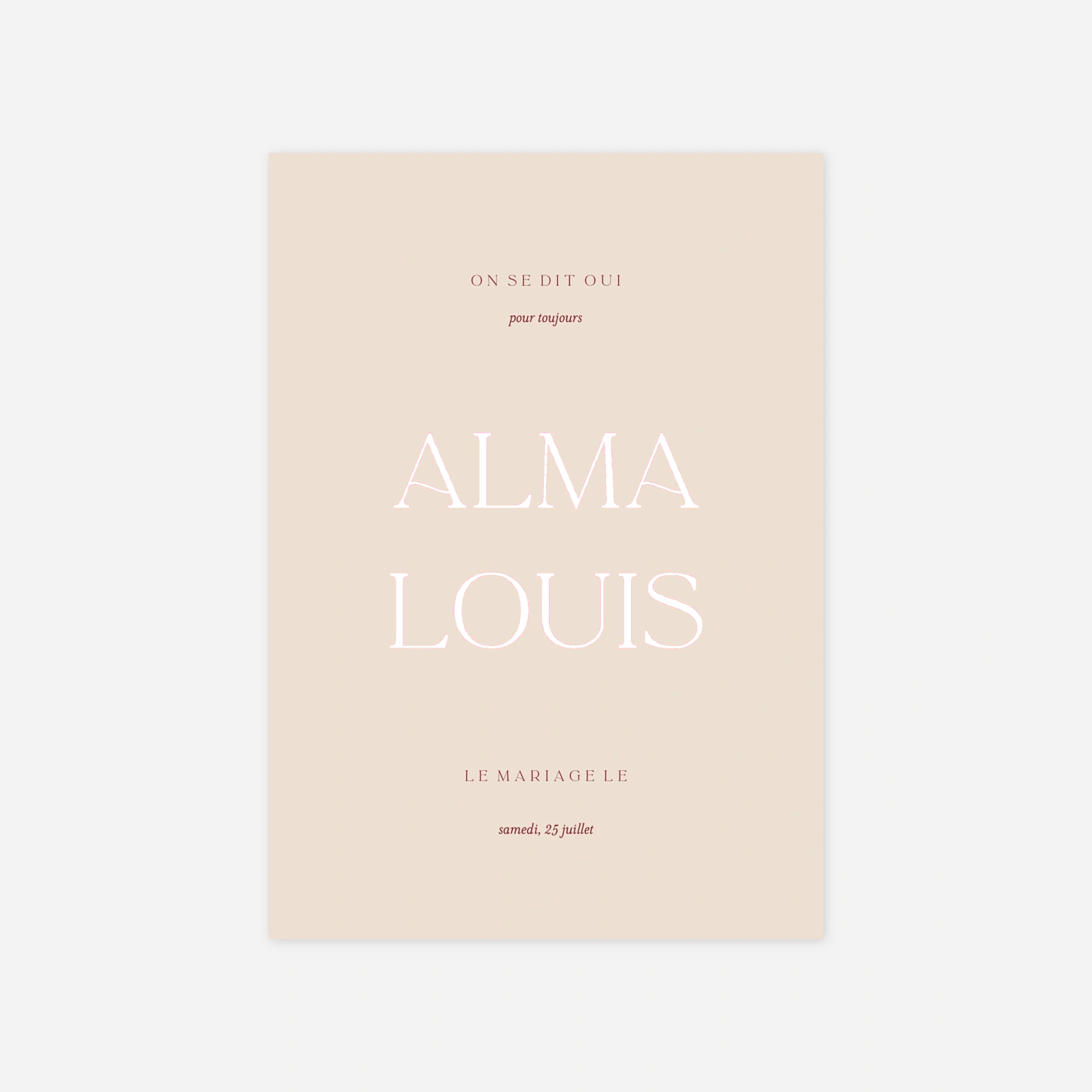 Avec son design épuré et sa typographie pleine de caractère, le faire-part de mariage L’essence incarne la beauté du minimalisme. Idéal pour annoncer votre union avec élégance, il laisse toute la place à l’essentiel : votre histoire et vos prénoms. Imprimé sur des papiers haut de gamme dans nos ateliers en France et en Allemagne, il allie modernité et savoir-faire artisanal. Profitez d’un échantillon gratuit pour découvrir toute la finesse de ce faire-part de mariage personnalisé.