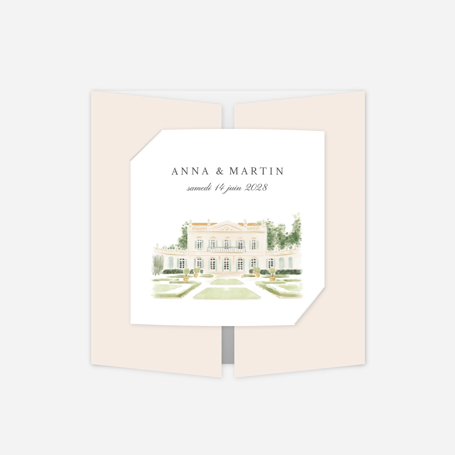 Associez praticité et élégance avec le faire-part de mariage “Lieu de noces”. Son design épuré dans des tons beige doux crée une atmosphère apaisante et met en valeur une délicate illustration de château, empreinte de charme romantique. Dans notre éditeur en ligne, vous pouvez personnaliser ce visuel selon vos envies – en le remplaçant par une illustration de votre lieu de réception ou une photo. Une manière unique de raconter votre histoire dès la première annonce. “Lieu de noces” est disponible en plusieurs formats et imprimé sur un papier de création haut de gamme, pour un rendu aussi raffiné que personnel