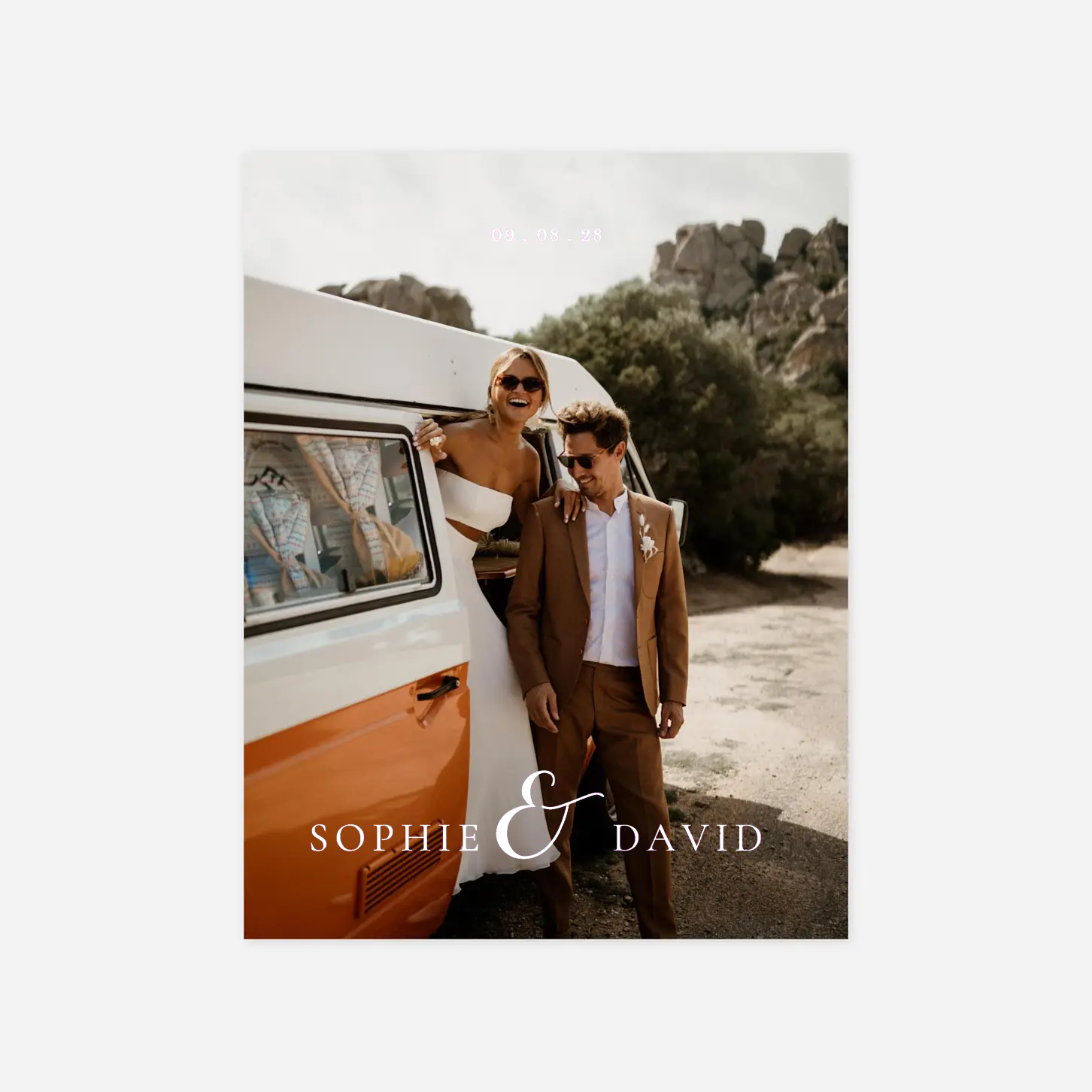 Le faire-part de mariage “Nos Prénoms” de vous séduira par son design simple et moderne. Les prénoms des mariés mis en avant, apportent une touche personnelle et élégante. La mise en page minimaliste et la typographie raffinée donnent à cette carte un aspect contemporain. Vous pouvez également demander un échantillon gratuit pour découvrir la qualité de nos papiers de création. Offrez à vos invités une invitation raffinée qui reflète l'importance de ce moment unique.