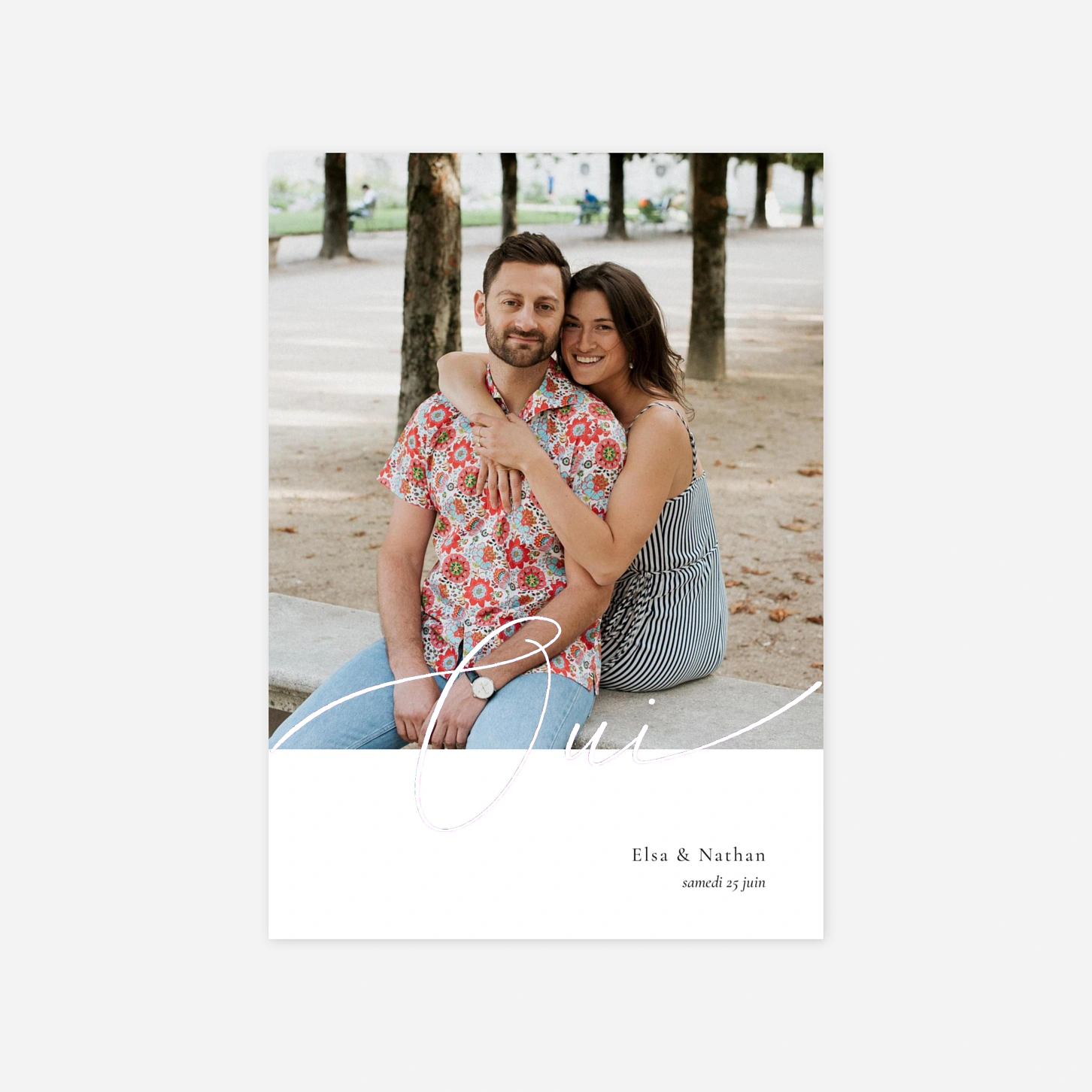 Simplicité et élégance se rencontrent sur le faire-part de mariage Oui. Sur votre plus jolie photo, votre “Oui” s’inscrit élégamment en lettres dorées, présage d’une cérémonie d’exception. Un bandeau blanc vous offre la place d’y apposer vos deux prénoms et la date de votre union. Le verso de la carte laisse découvrir votre message d’invitation inscrit sobrement. Ce faire-part se personnalise au recto et au verso avec votre texte et votre photo sur notre éditeur en ligne. Découvrez également tous nos faire-part de mariage dorés.