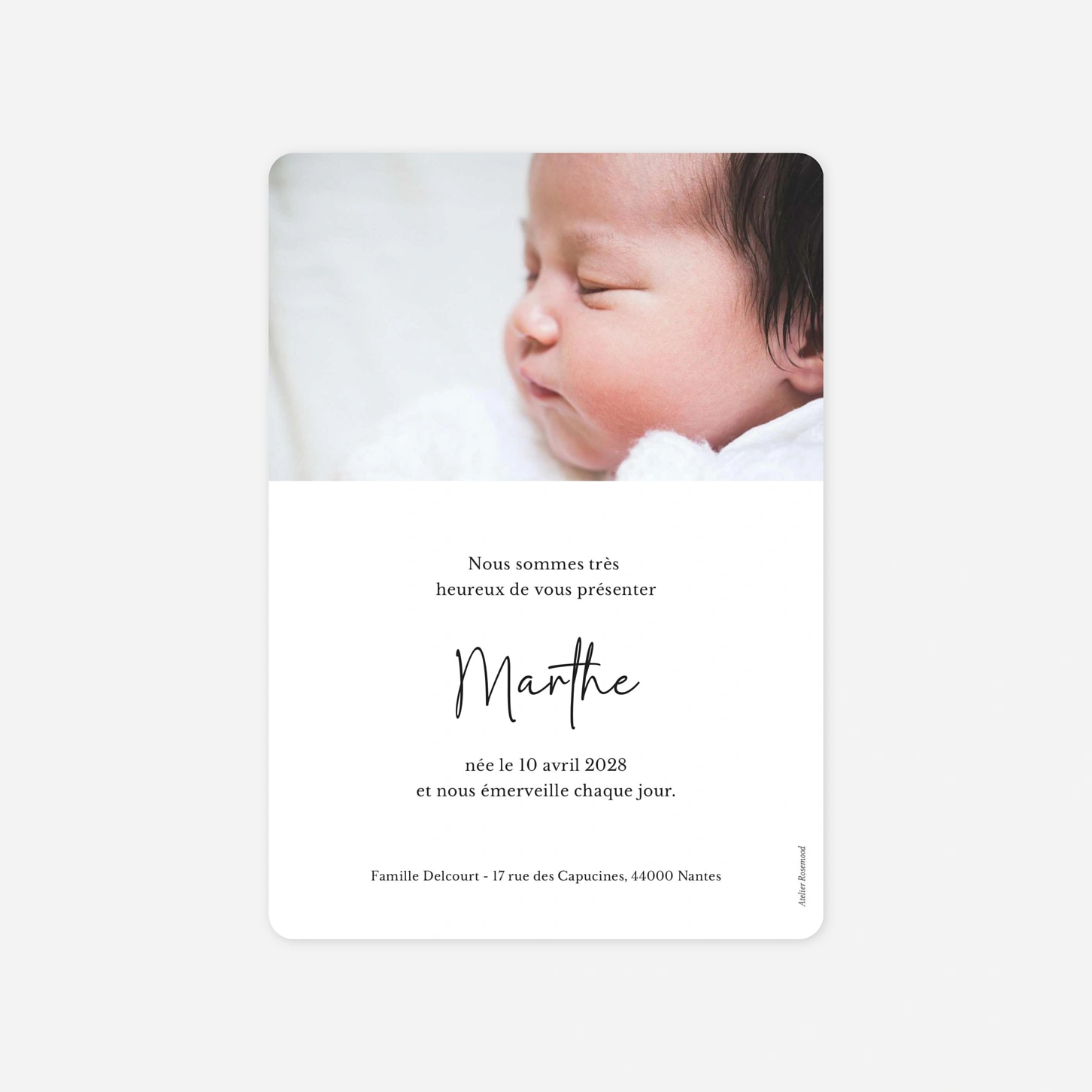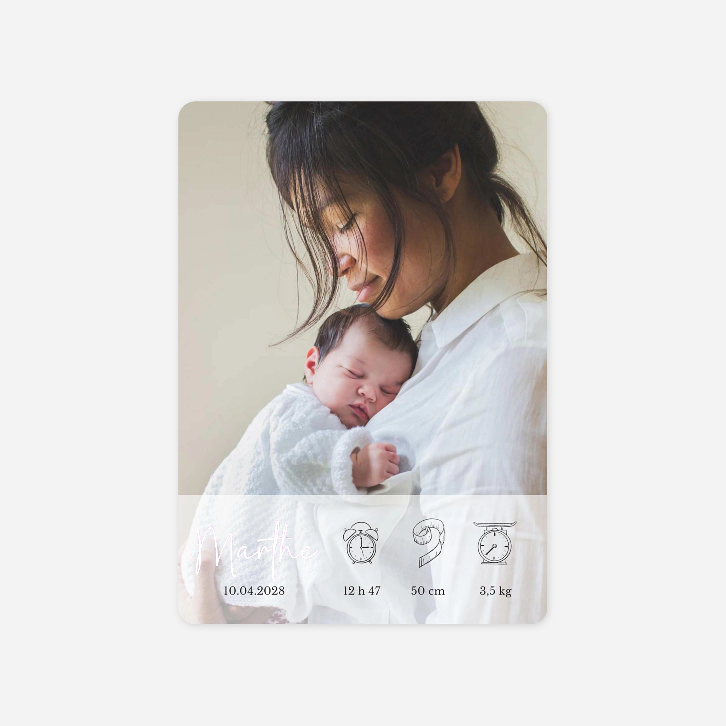 Le faire-part de naissance Beaux pictogrammes célèbre avec tendresse l’arrivée de votre bébé à travers une mise en page douce et épurée. Les jolis pictogrammes illustrent avec poésie les premiers détails de votre enfant, pour un souvenir aussi précieux qu’intemporel. Imprimé sur nos papiers premium dans nos propres ateliers en France et en Allemagne, il allie émotion et savoir-faire artisanal. Profitez d’un échantillon gratuit pour découvrir la qualité de nos faire-part de naissance personnalisés.