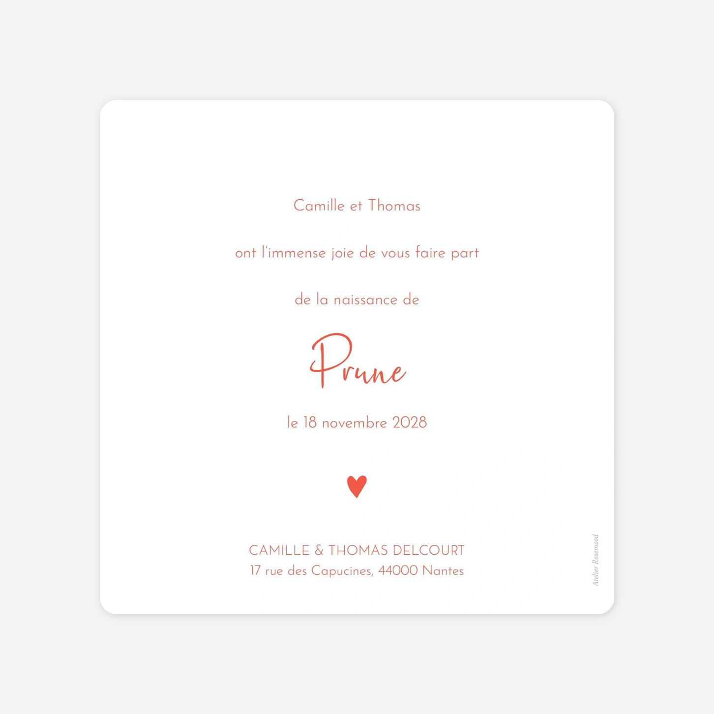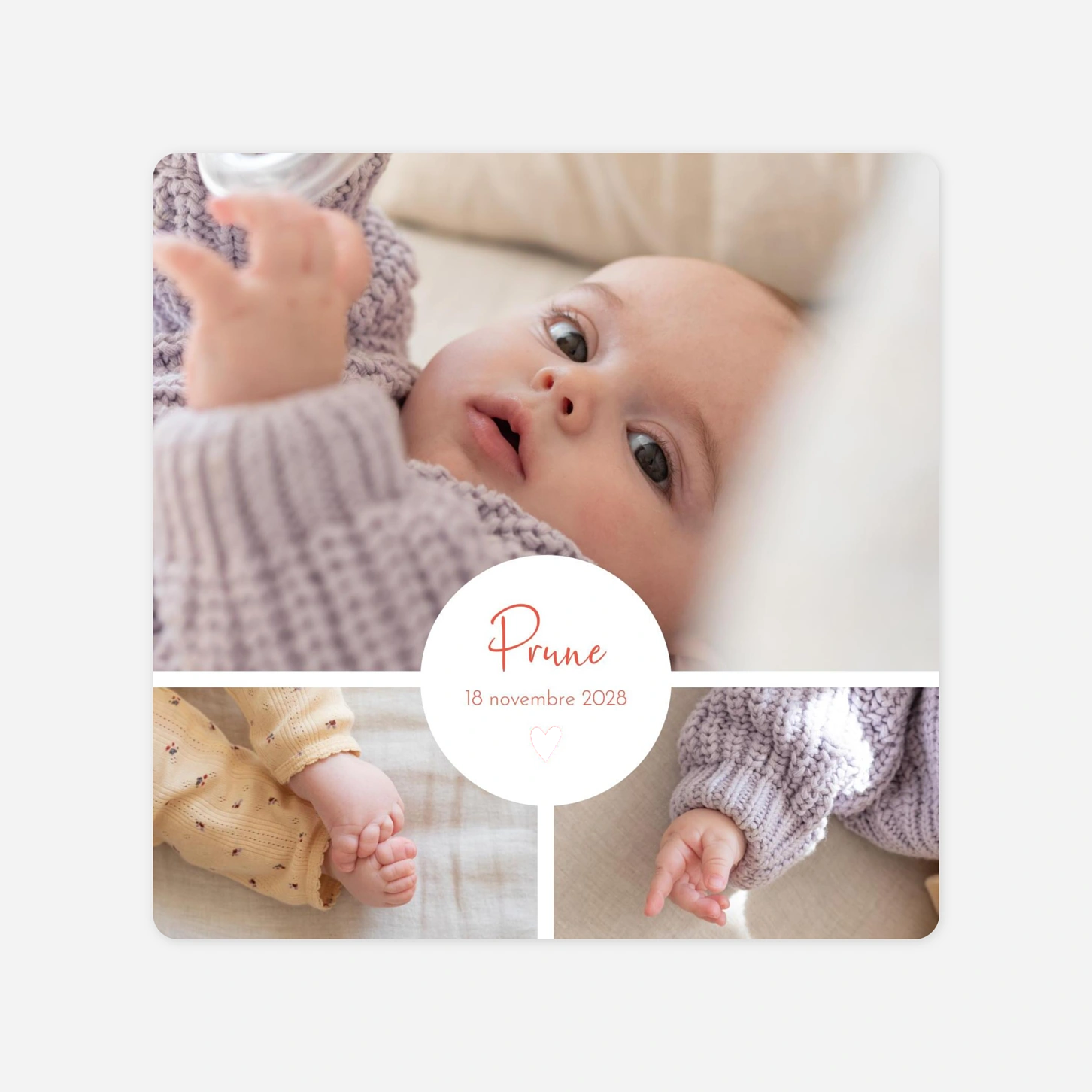 Sous l’apparente simplicité de son design, le faire-part de naissance Coeur médaillon dévoile un délicat détail qui apportera élégance et tendresse à votre annonce. Ce petit coeur se pare d’or pour sublimer les jolies photos que vous leur partagerez. Ce joli motif souligne tout en finesse le prénom de votre enfant et sa date de naissance, mis en avant dans un délicat médaillon.