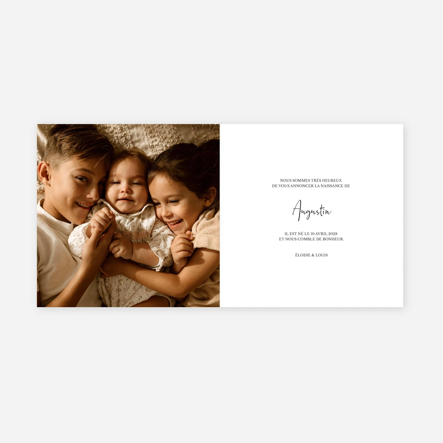 Chaleureux et empreint de tendresse, le faire-part de naissance Collage du cœur célèbre l’arrivée de votre bébé à travers vos plus belles photos. Ce design met en lumière les liens précieux qui unissent votre famille, dans un style naturel et authentique. Imprimé sur nos papiers premium dans nos propres ateliers en France et en Allemagne, il allie émotion et savoir-faire. Profitez d’un échantillon gratuit pour découvrir la qualité de votre création avant impression.