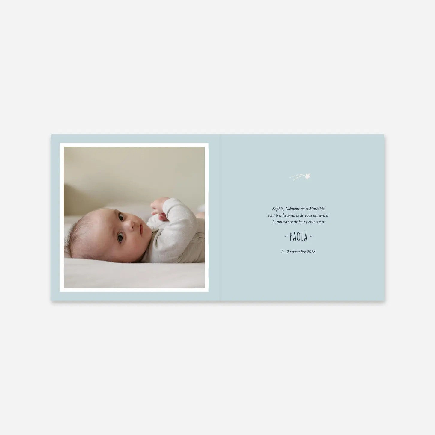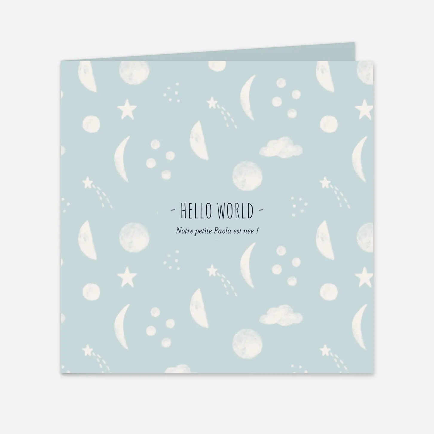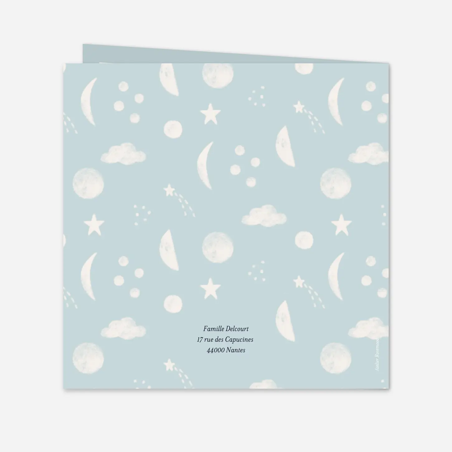 Avec le faire-part de naissance Cosmos (portrait), c’est tout un univers céleste qui s’harmonisera autour de votre heureuse annonce. Quelques petites planètes, quartiers de lune, nuages cotonneux et étoiles filantes s’illustrent sur un fond de couleur bleu ciel ou bleu nuit pour un rendu doux et poétique.