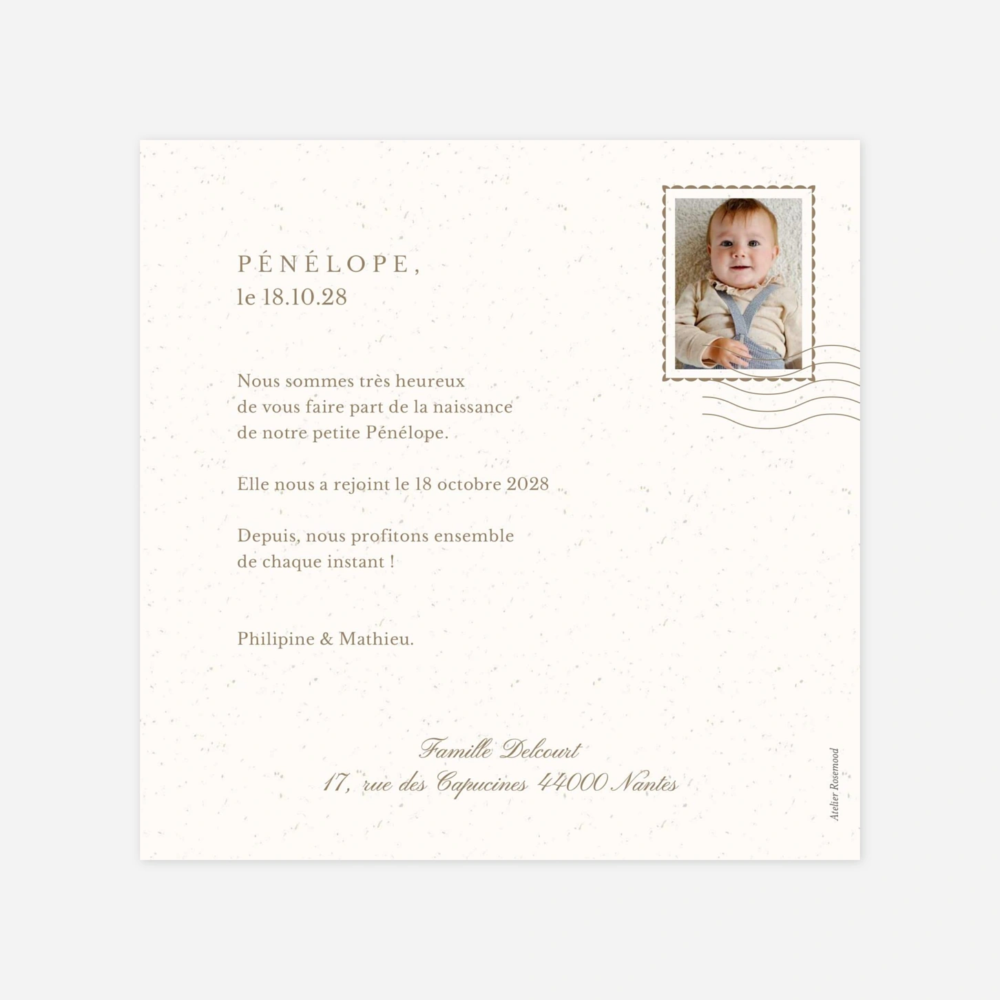 Le faire-part de naissance « Courrier du cœur » célèbre l’arrivée de votre enfant avec la tendresse d’une carte envoyée aux êtres chers. Son timbre en forme de cœur, rehaussé si vous le souhaitez d’une délicate dorure, apporte une touche lumineuse et raffinée à vos photos. Créé par nos designers et imprimé avec soin dans nos ateliers en France et en Allemagne, il met en valeur chaque détail avec élégance. Recevez gratuitement un échantillon pour apprécier la qualité de nos papiers et finitions.
