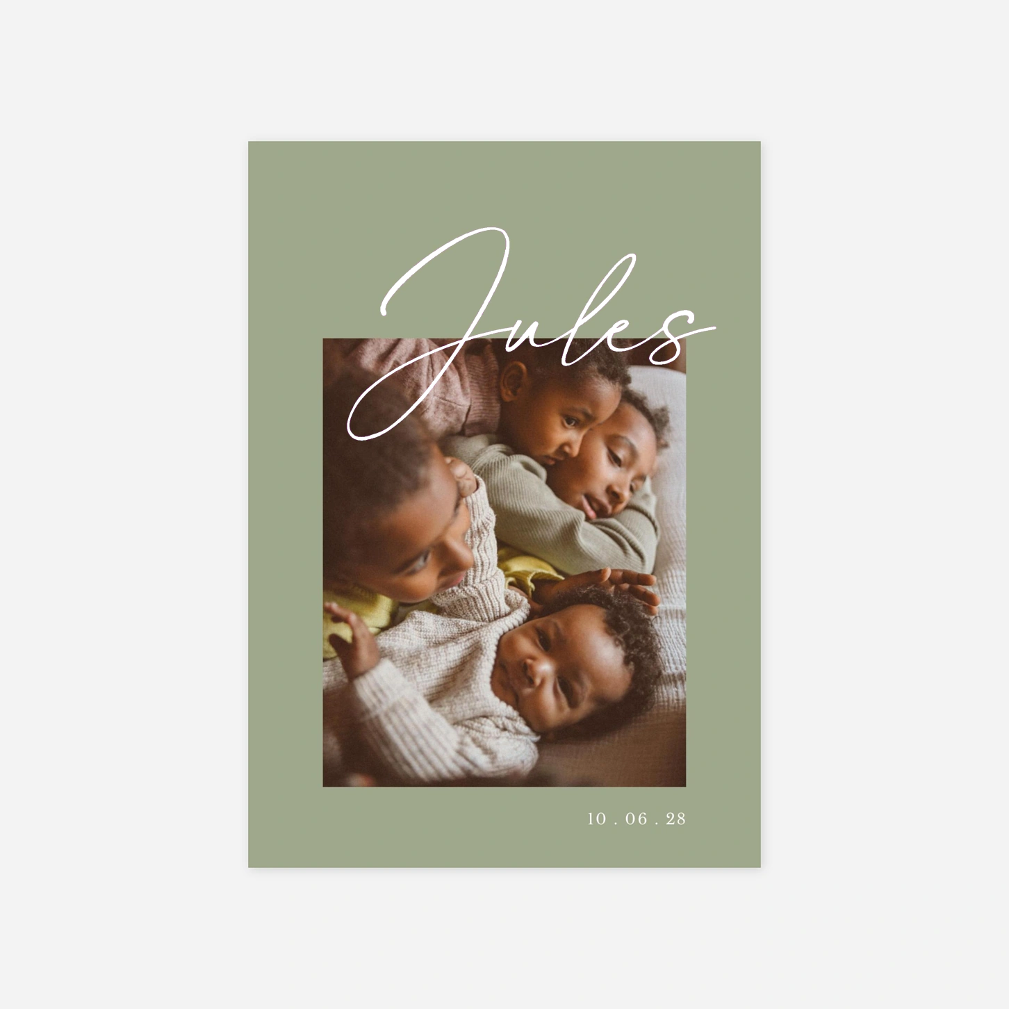 La photo de votre bébé entourée d’un cadre coloré, son prénom délicatement inscrit pour la rehausser… Partagez votre joie avec simplicité et élégance avec le faire-part de naissance Heureux événement. Au verso, des petits pictos viendront illustrer les détails clés de sa naissance. 3 coloris au choix : vert, beige ou terracotta.