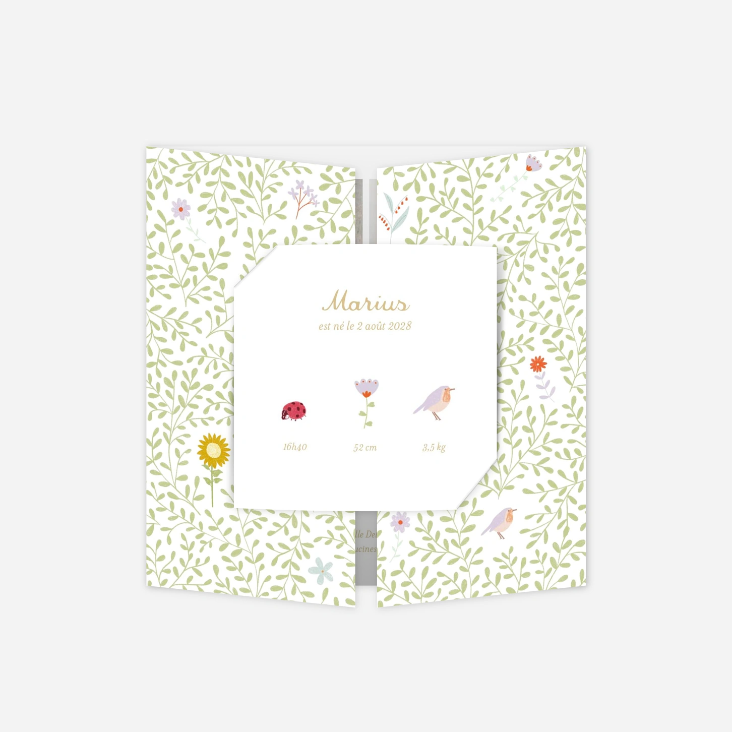 Le faire-part de naissance "Le Cottage des Animaux" est le modèle parfait pour annoncer l’arrivée de votre bébé. Entre ses délicats branchages qui encadrent la mise en page, une coccinelle, une fleur champêtre et un petit oiseau viennent illustrer avec poésie les détails de naissance. Cette douce composition rappelle la magie d’un jardin habité de vie et de bienveillance. Imprimé avec soin dans nos ateliers en France et en Allemagne, ce modèle allie créativité et savoir-faire artisanal. Profitez d’un échantillon gratuit pour en découvrir toute la finesse avant de le personnaliser.