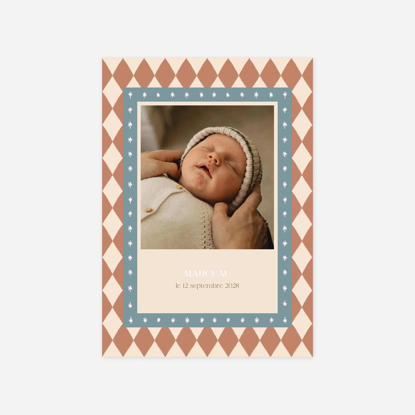 Le faire-part de naissance « Naissance chromatique » se pare d’un décor graphique aux losanges dansants, rappelant l’univers tendre et festif de l’enfance. Le cadre coloré soulignera avec poésie la première photo de votre bébé. Imaginé par nos designers et imprimé avec soin dans nos ateliers en France et en Allemagne, il mêle douceur et créativité pour une annonce unique. Recevez gratuitement un échantillon et laissez-vous séduire par son charme intemporel.