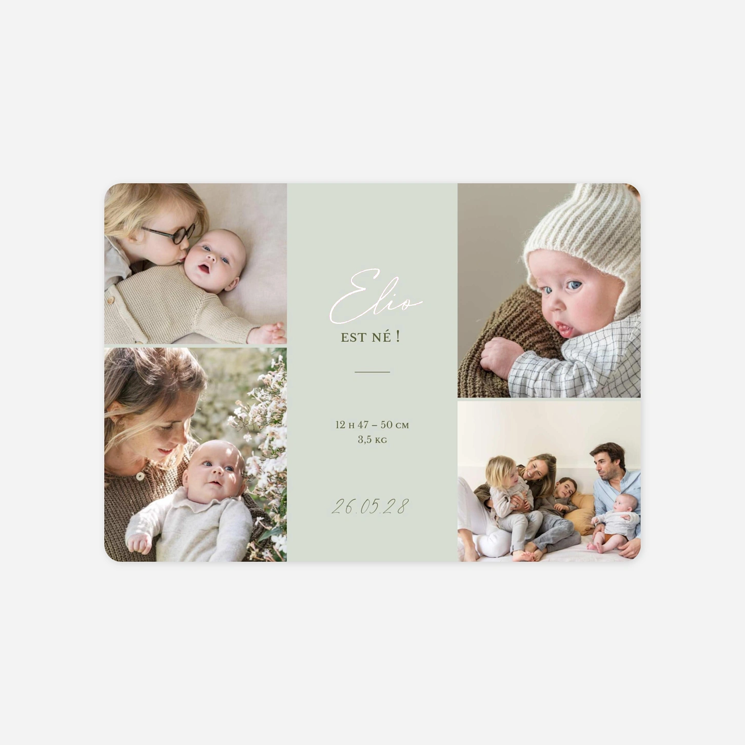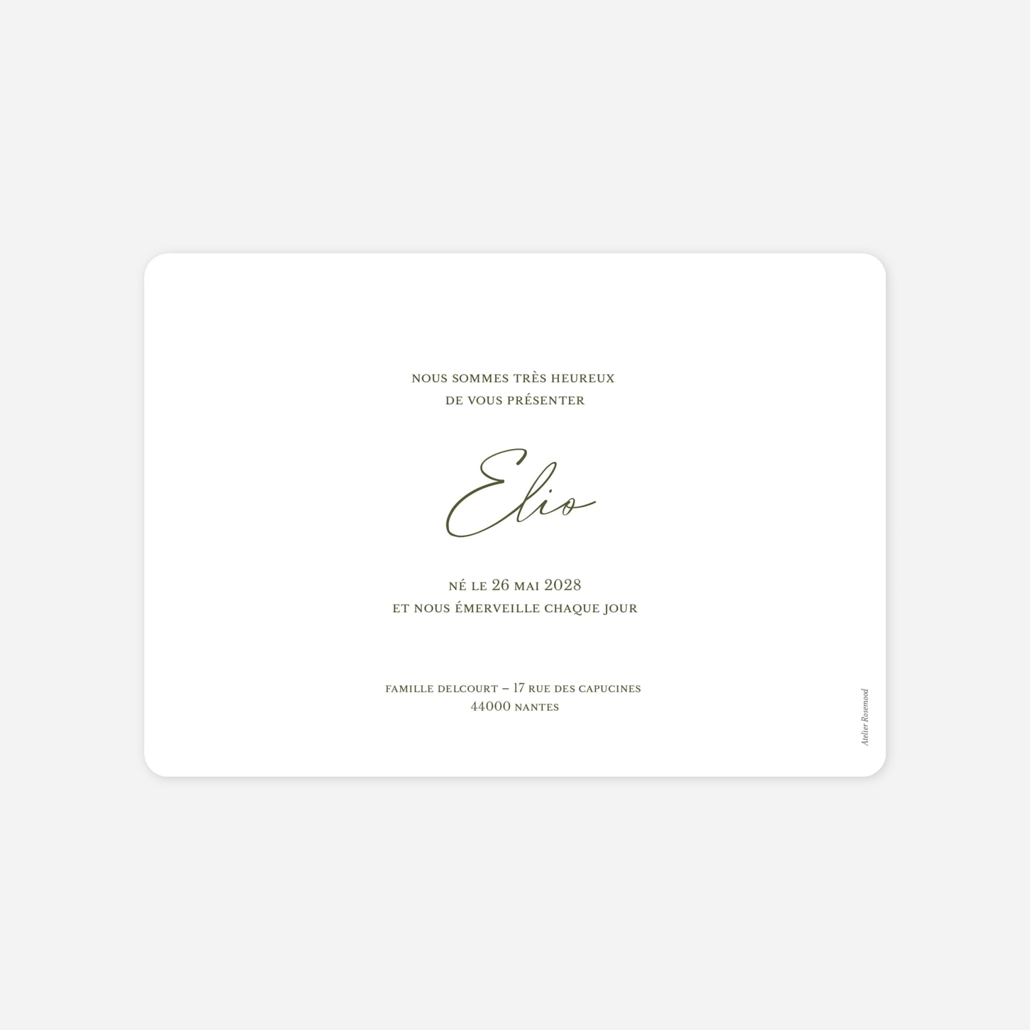 Le faire-part de naissance Naissance met en lumière toute la douceur et l’émotion des premiers instants partagés avec votre bébé. Son style épuré et délicat vous permet d’annoncer cette merveilleuse nouvelle avec tendresse et élégance. Conçu dans notre atelier avec des papiers premium et une impression haute précision, il sublimera vos plus belles photos. Profitez d’un échantillon gratuit pour découvrir la qualité de ce modèle personnalisé.