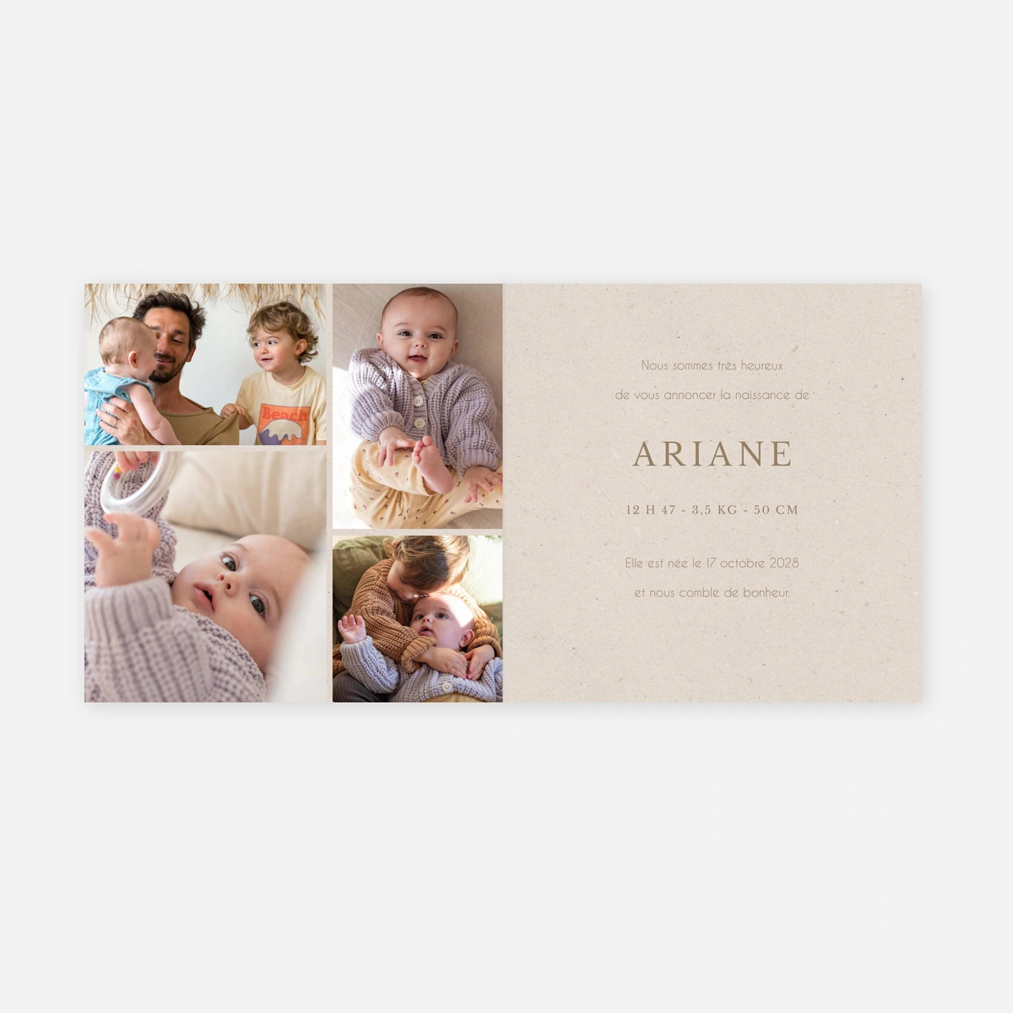 Le faire-part de naissance «Notre Début» capture avec tendresse les premiers instants partagés entre frères et sœurs. Ce design délicat met en lumière la douceur des liens familiaux et célèbre l’arrivée de votre bébé avec une élégance naturelle. Imprimé sur nos papiers premium dans nos ateliers en France et en Allemagne, il saura émouvoir vos proches par sa simplicité raffinée. Profitez de nos échantillons gratuits pour découvrir la qualité de ce faire-part de naissance personnalisé.