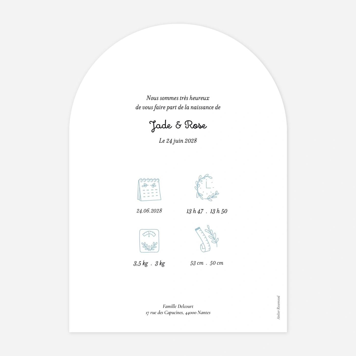 Le faire-part de naissance "Notre foyer" célèbre l’arrivée de vos jumeaux avec chaleur et douceur. Son design original en arche, ponctué d’illustrations délicates, évoque la tendresse d’un cocon familial. Conçu dans nos ateliers et imprimé sur des papiers premium, il met en valeur vos photos avec élégance. Profitez d’un échantillon gratuit pour découvrir ce faire-part de naissance personnalisé avant de le créer selon vos envies.