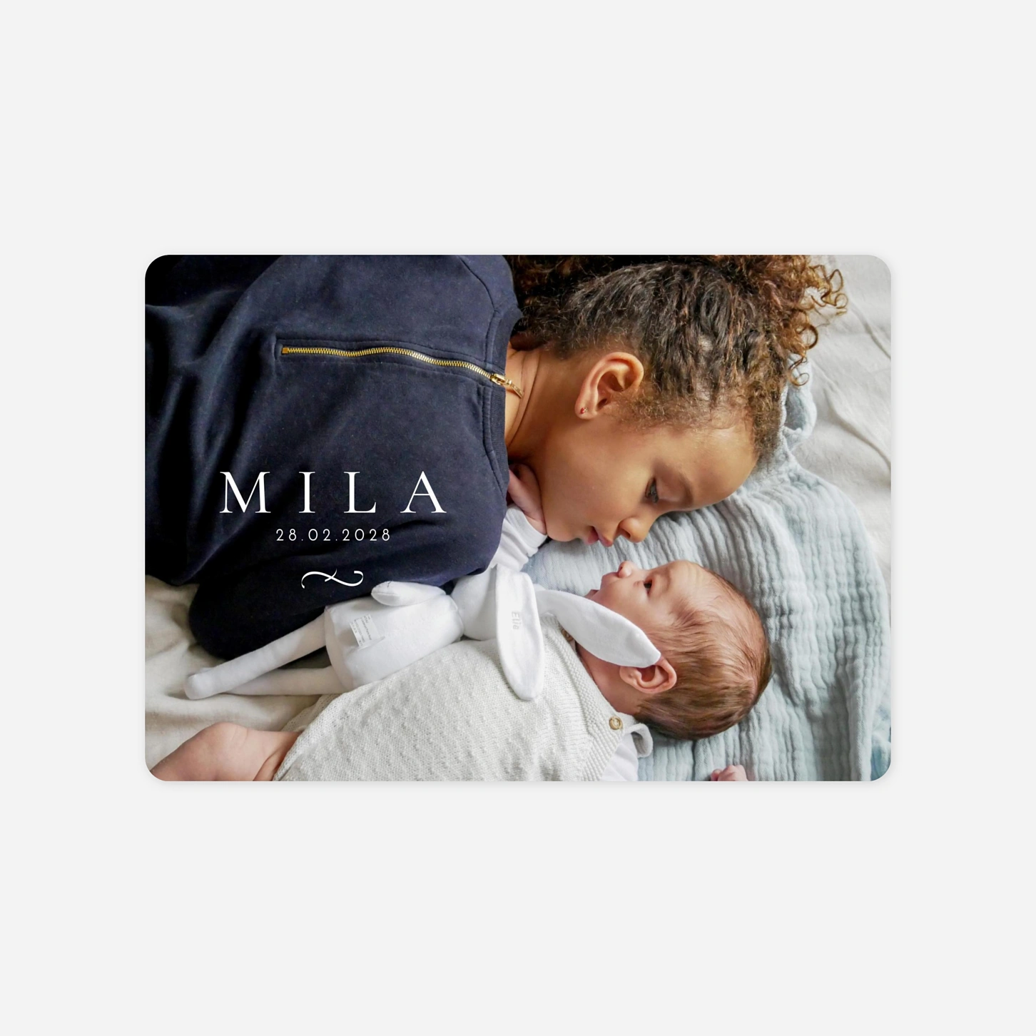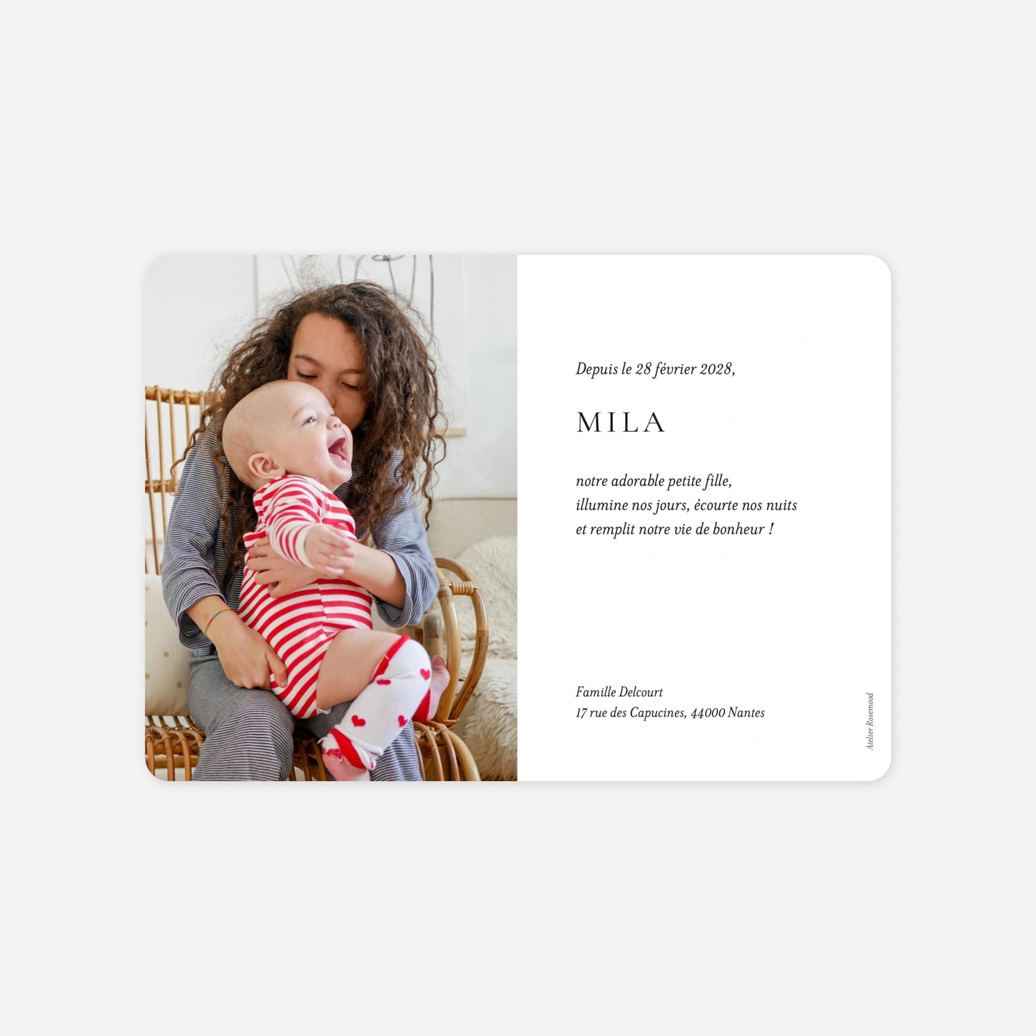 Voici une création qui parlera tout particulièrement aux amateurs de musique ou de calligraphie classique. Ce délicat détail illustré à la plume orne le faire-part de naissance Solfège pour un rendu sobre et élégant. Il souligne le prénom de votre enfant et sa date de naissance sur une photo de son joli minois qui habille tout le recto de votre carte. Nos designers ont imaginé ce modèle avec deux coloris pour le texte : blanc ou brun.