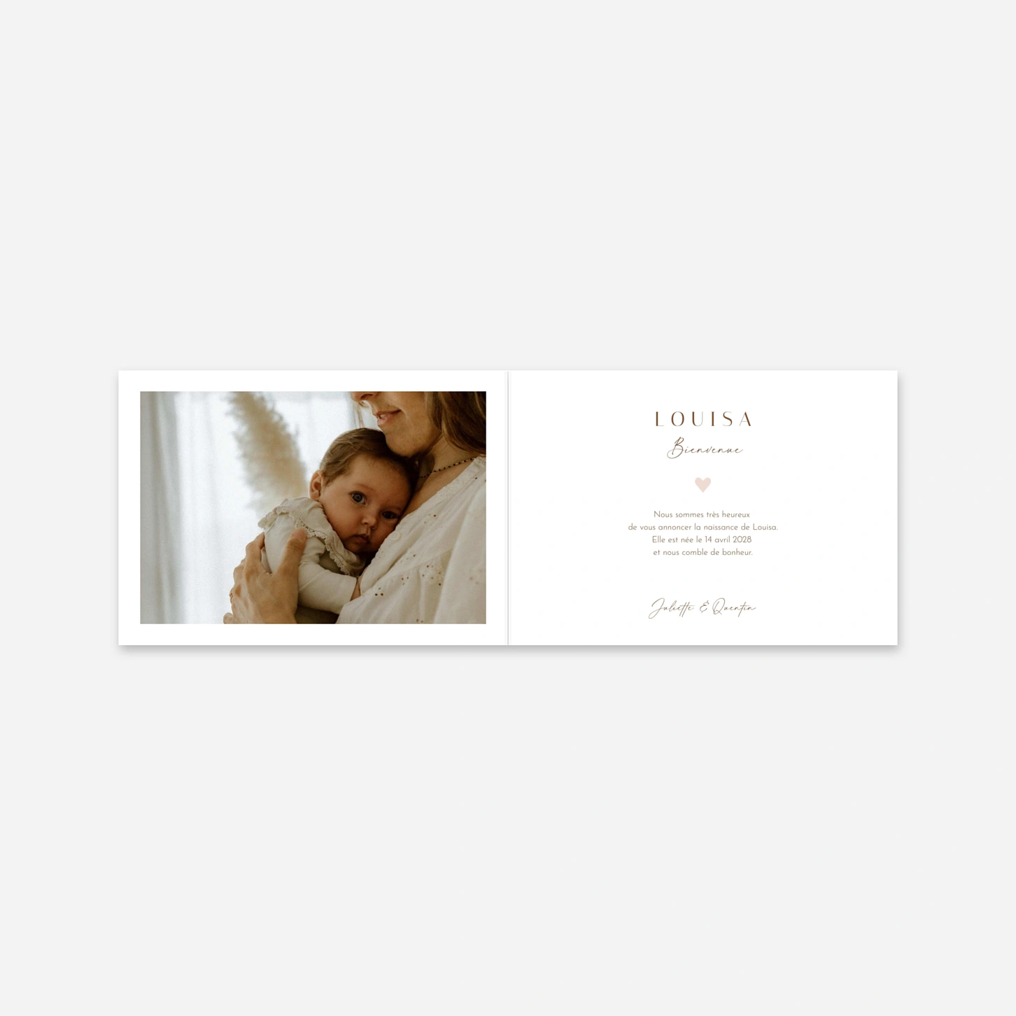Le faire-part de naissance « Trésor doré » dévoile un design épuré et tendre pour annoncer avec émotion l'arrivée de votre enfant. Ce modèle élégant met en lumière vos plus beaux clichés ainsi que les détails précieux de sa venue au monde grâce à une mise en page soignée. Imaginée au sein de notre atelier, cette création se personnalise facilement en ligne pour devenir un souvenir unique à partager avec vos proches. Vous pouvez d’ailleurs commander un échantillon gratuit afin de découvrir la qualité de notre impression et de nos papiers premium. Personnalisez votre annonce dès maintenant pour offrir un écrin de douceur à cette heureuse nouvelle.