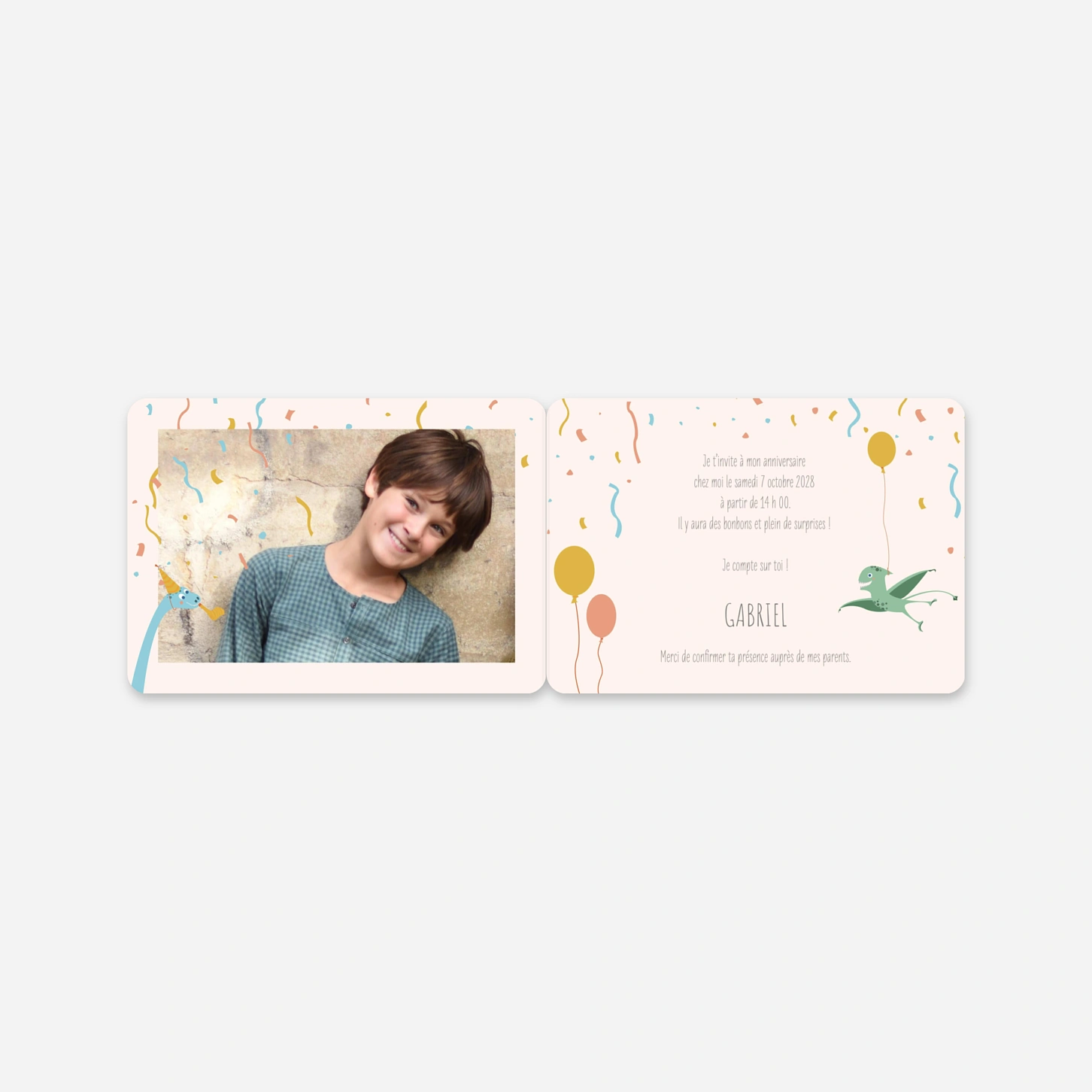 Faites rugir de plaisir les petits invités avec l’invitation d’anniversaire enfant « Dinos en fête », un modèle coloré et plein de fantaisie. Ses illustrations de dinosaures festifs, chapeautés et entourés de confettis, promettent une journée remplie d'aventures et de rires. Toutes nos créations sont imaginées en interne afin de vous proposer des designs uniques pour chaque étape de la vie de vos enfants. Nous assurons une impression haute précision dans nos propres ateliers pour garantir un rendu parfait à votre papeterie. Personnalisez facilement votre texte en ligne pour convier tous les copains à cette fête préhistorique.