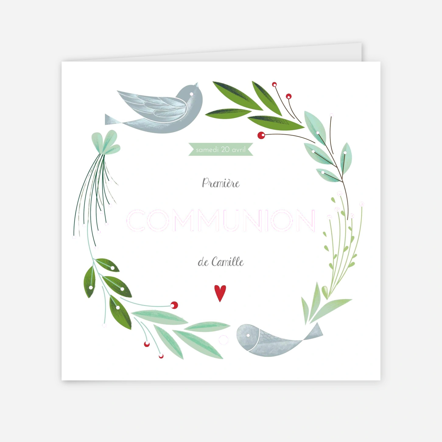Annoncez cette célébration spirituelle avec légèreté grâce au faire-part de communion « Au fil du vent », une création au design poétique et coloré. Ce modèle s'illustre d'une couronne végétale stylisée où s'envolent de tendres oiseaux et de petits poissons, symbolisant avec douceur ce moment de joie partagée. Imaginée par nos designers et imprimée sur des papiers premium dans nos propres ateliers, cette invitation garantit un rendu d'une grande finesse. Profitez d'une configuration facile du texte pour personnaliser votre message et convier vos proches avec élégance à cet événement unique. Personnalisez votre ensemble en ligne dès maintenant.