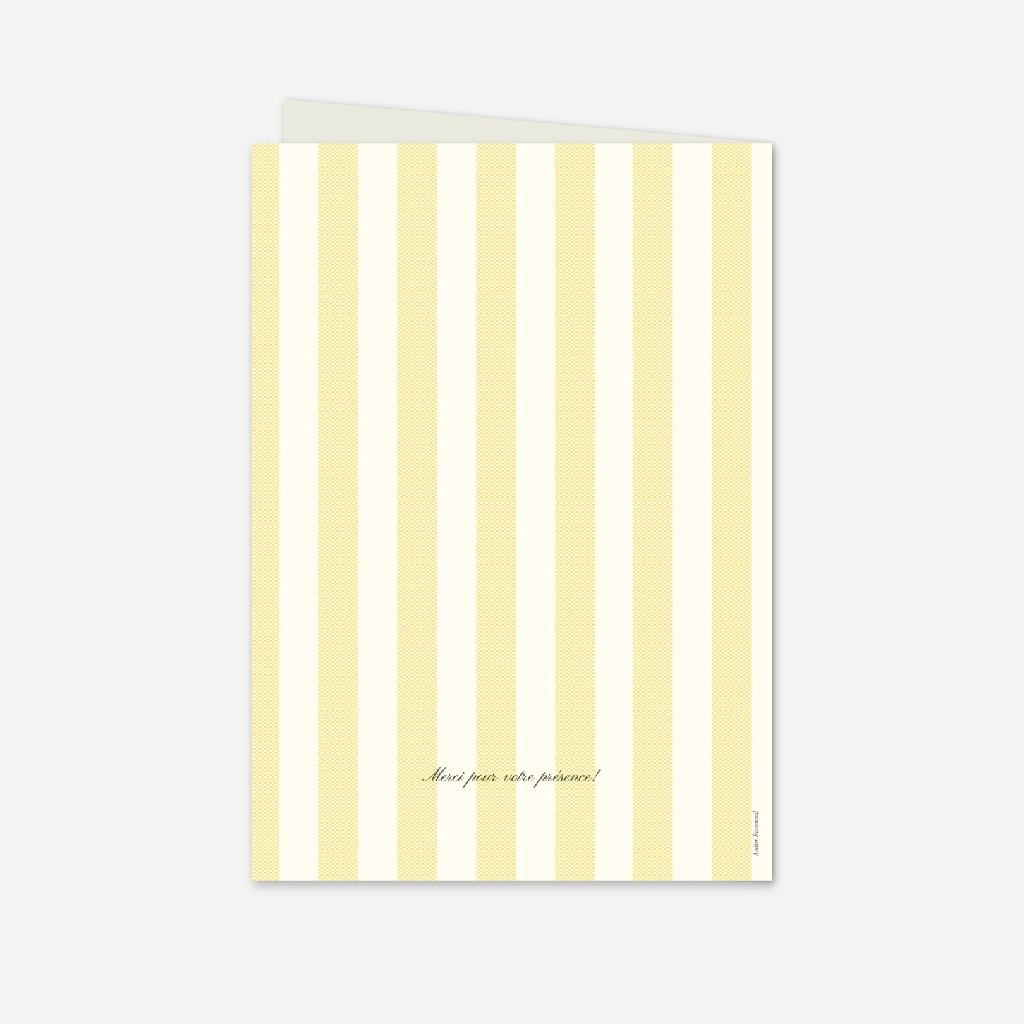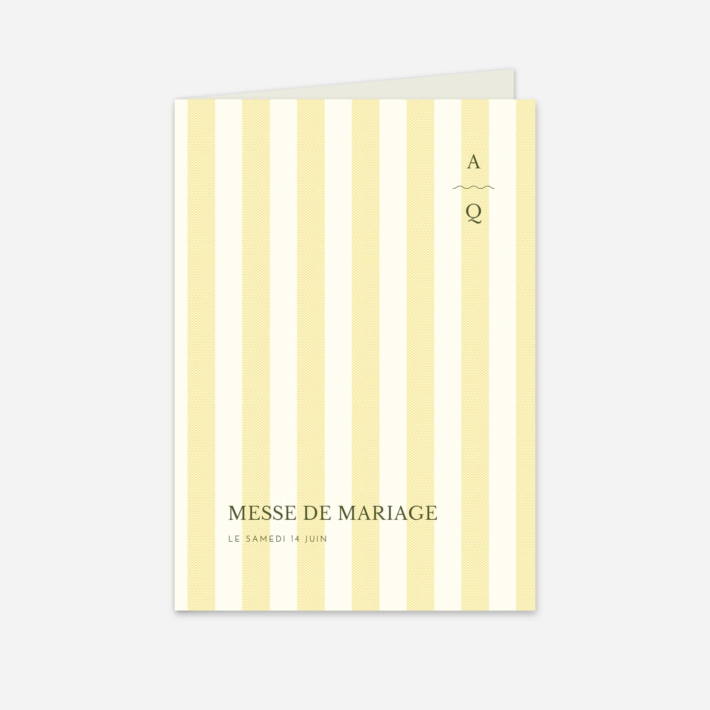 Le livret de messe "Dolce Amore" séduit par son élégance sobre avec de fines rayures bleu clair ou jaune, parfaite pour des mariages classiques ou laïques. Grâce à notre éditeur en ligne, vous pouvez personnaliser le modèle selon vos envies. Au verso, un mot de remerciement, un psaume biblique ou une citation adaptée trouve sa place. Plié, le livret sert d’enveloppe pratique pour les paroles des chants et le déroulement de la cérémonie.