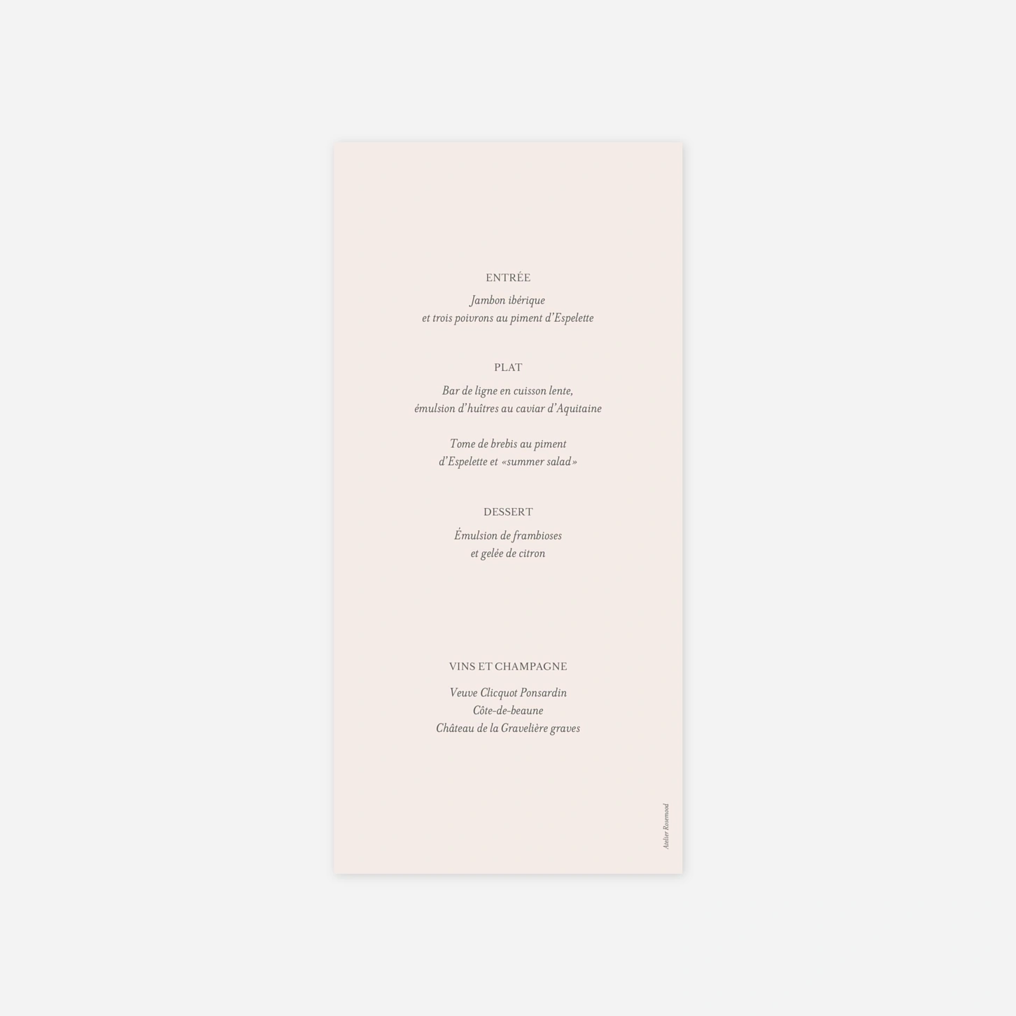 Élément incontournable de votre papeterie de table, le design de votre menu est à choisir avec soin et attention afin qu’il reflète parfaitement le thème que vous avez imaginé pour votre jour J. Grâce à notre outil de création en ligne, vous pourrez facilement ajouter les détails de votre menu, met après met, pour éveiller l'appétit de vos invités. Découvrez toute la gamme « Lieu de noces » pour un jour J inoubliable.