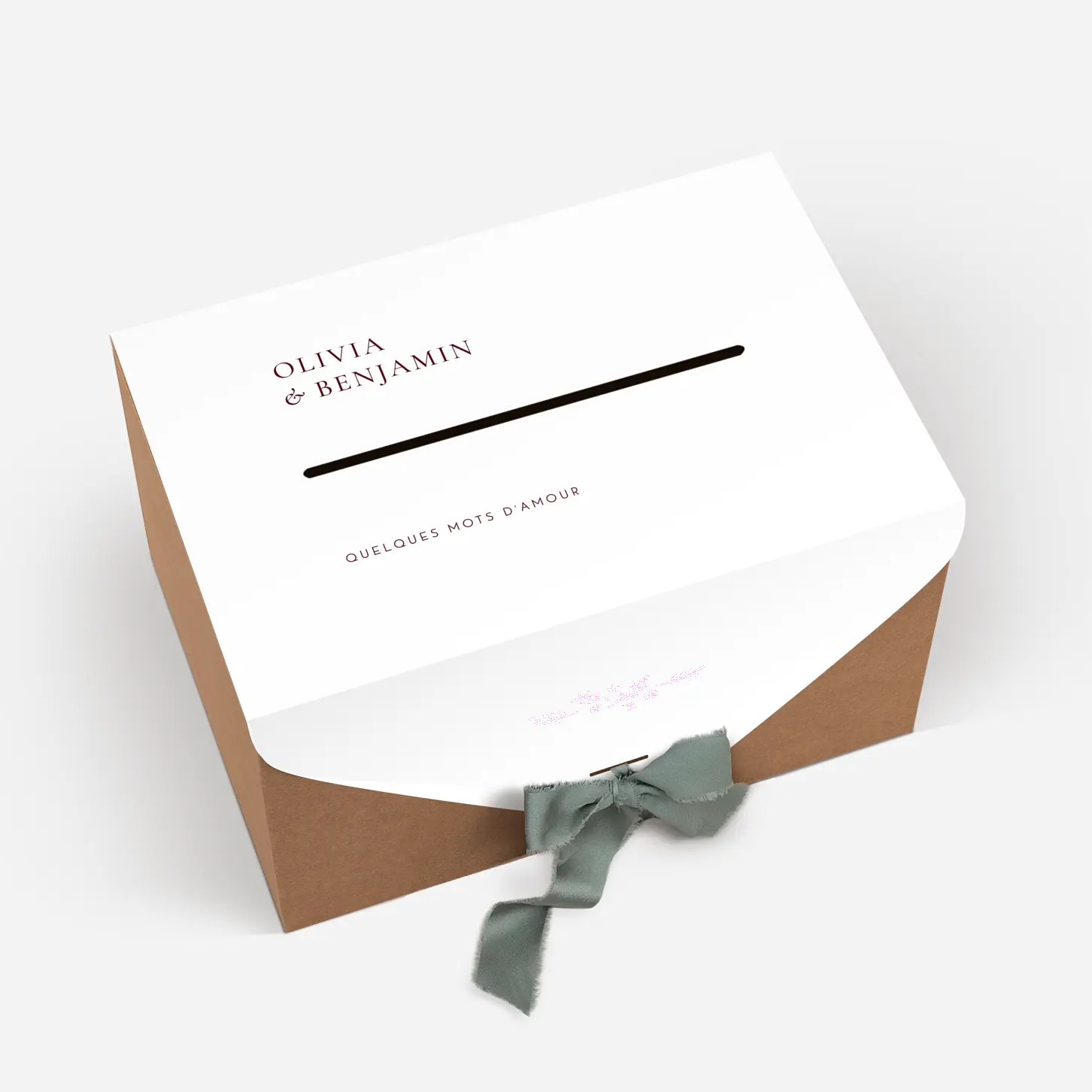 L’urne de mariage "Laure de Sagazan II" sera idéale pour recueillir les cartes, enveloppes et petits mots de vos invités. Habillée d’un élégant papier cartonné et munie d’un ruban coloré, nous vous laissons le soin de l’assembler vous-même pour le jour J. Assortie à votre papeterie de table, elle sera un bel objet déco rappelant délicatement le thème de votre union.
