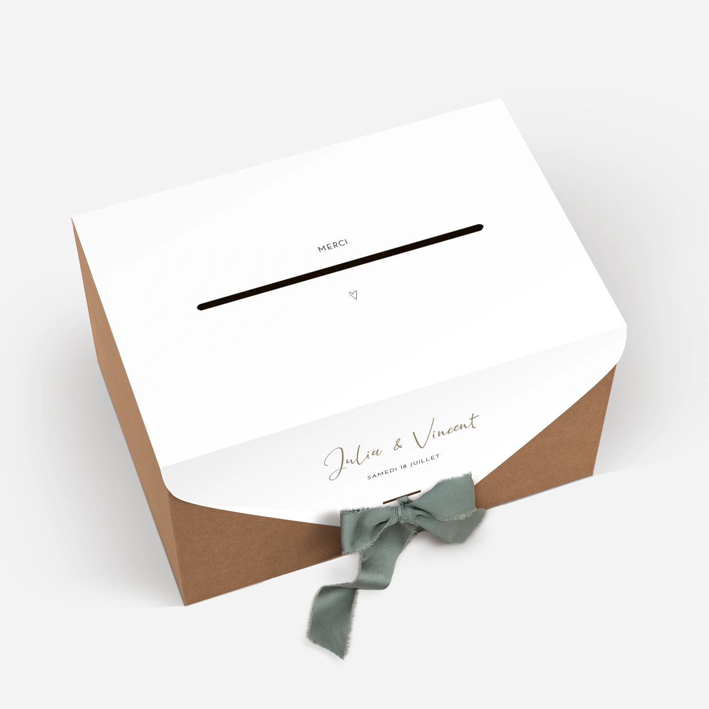L’urne de mariage « Les mariés champêtres » sera idéale pour recueillir les cartes, enveloppes et petits mots de vos invités. Habillée d’un élégant papier cartonné et munie d’un ruban coloré, nous vous laissons le soin de l’assembler vous-même pour le jour J. Assortie à votre papeterie de table, elle sera un bel objet déco rappelant délicatement le thème de votre union.